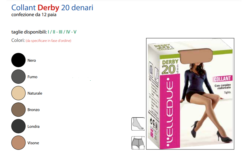 12 PAIA COLLANT ELLEDUE DERBY 20 DEN COLLANT SCATOLATO CON CORPINO RINFORZATO COLORI DISPONIBILI: NATURAL, VISONE NERO,FUMO , LONDRA , BRONZO TAGLIE DISPONIBILI: 1-2 3-4 5 QUALITA’ ELLEDUE