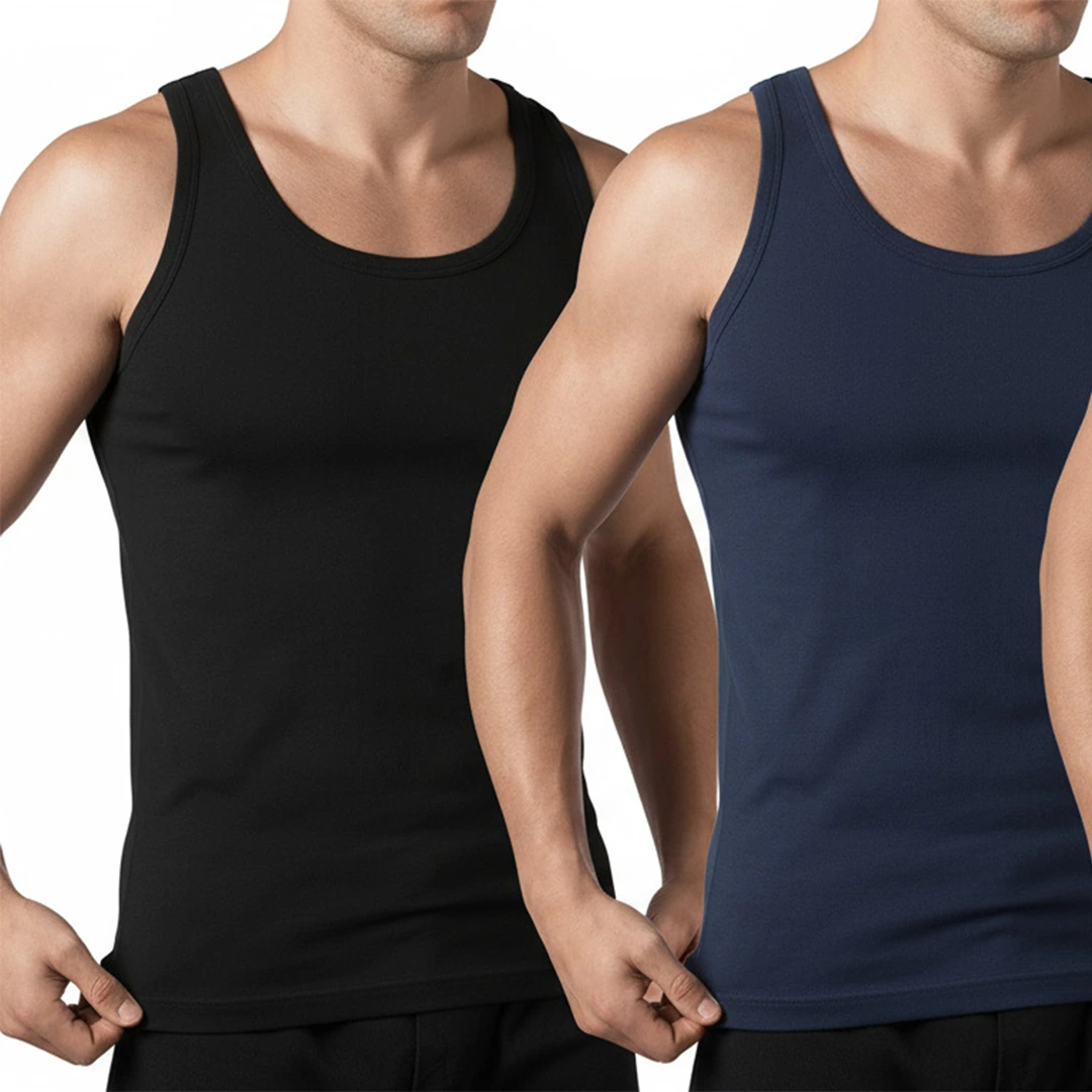 2 canotte uomo spalla larga in cotone bielastico, perfette per comfort, traspirabilità e libertà di movimento.