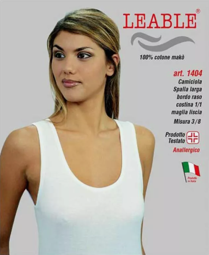 3 MAGLIE CANOTTA SPALLA LARGA LEABLE ART. 1404 CANOTTA DONNA IN JERSEY DI PURO COTONE MAKO’ CON PROFILO IN RASO LISCIO COMPOSIZIONE: 100% COTONE MAKO’ TAGLIE DISPONIBILI: 3-4-5-6-7-8 COLORE DISPONIBILE: BIANCO QUALITA’ LEABLE
