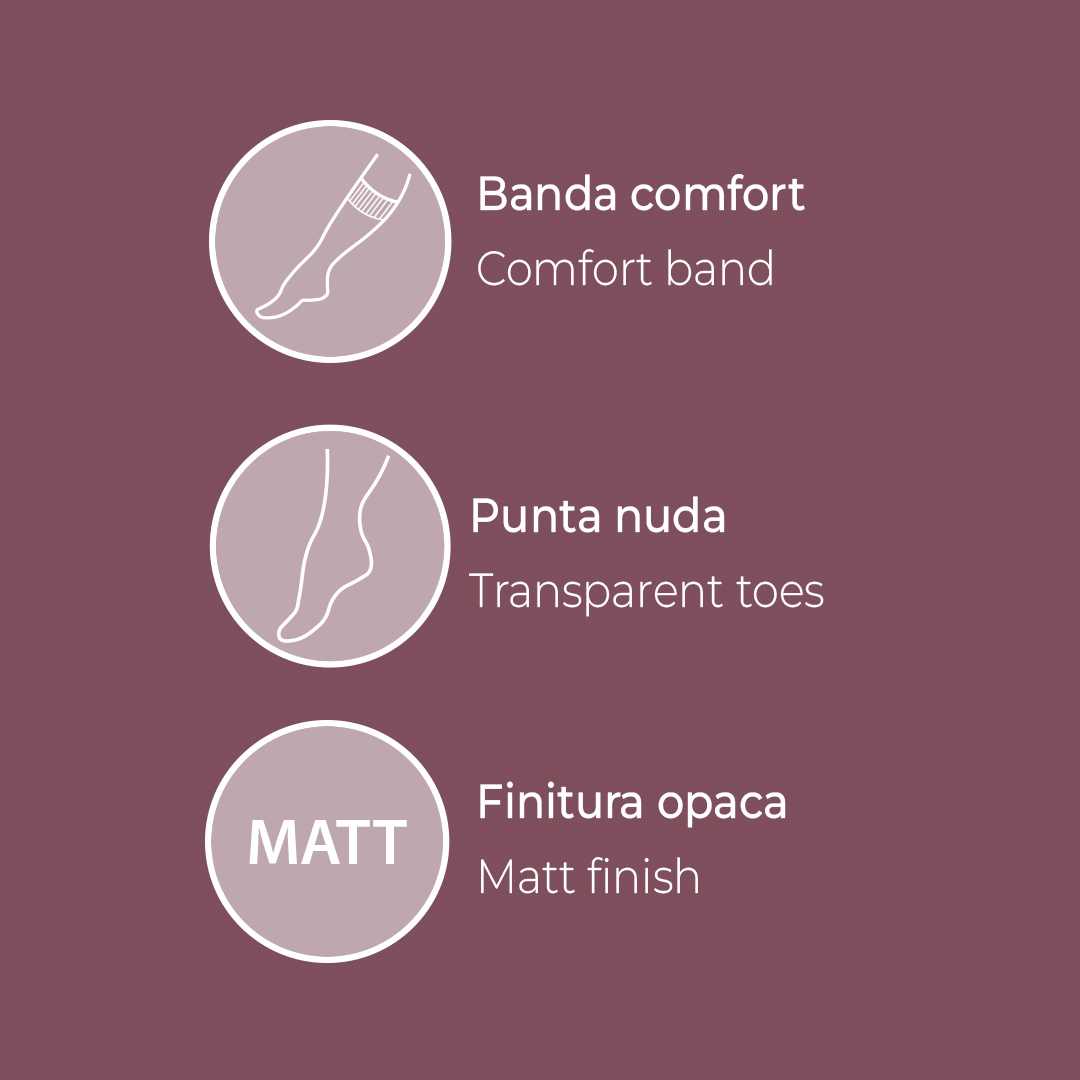 5 collant in microfibra soft comfort, 80 denari, coprente e opaco, con corpino tutto nudo, tassello rinforzato, cinturino soft e punte nude.