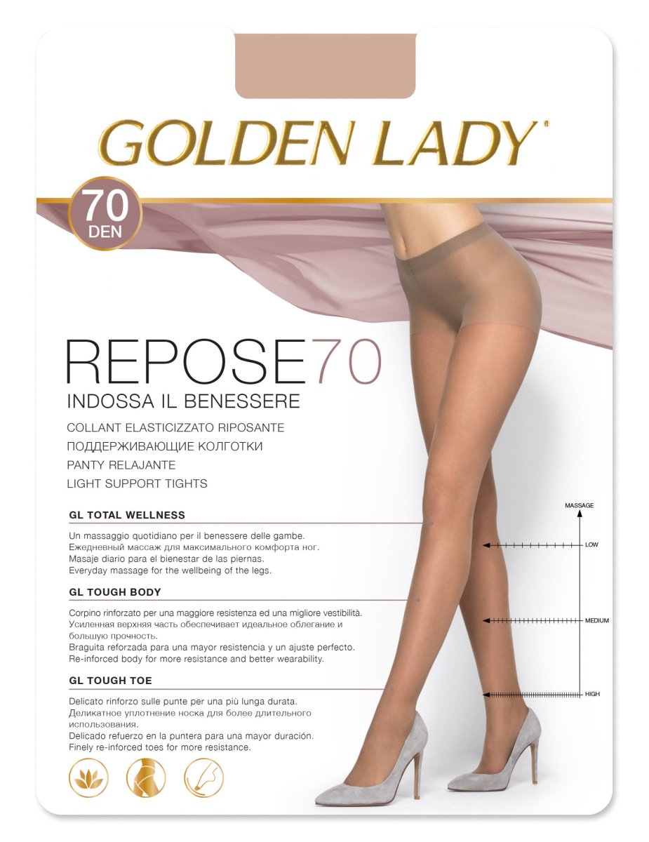 5 PAIA COLLANT GOLDEN LADY ART. REPOSE 70 DENARI COLLANT ELEGANTE CON CUCITURE PIATTE , TASSELLINO IN COTONE CON CORPINO CONTENITIVO CHE SVOLGE UNA MODERATA AZIONE DEFATICANTE TAGLIE DISPONIBILI: 2/S 3/M 4/L XL COLORI DISPONIBILI:MELON,DAINO,CASTORO,FUMO,NERO QUALITA’ GOLDEN LADY