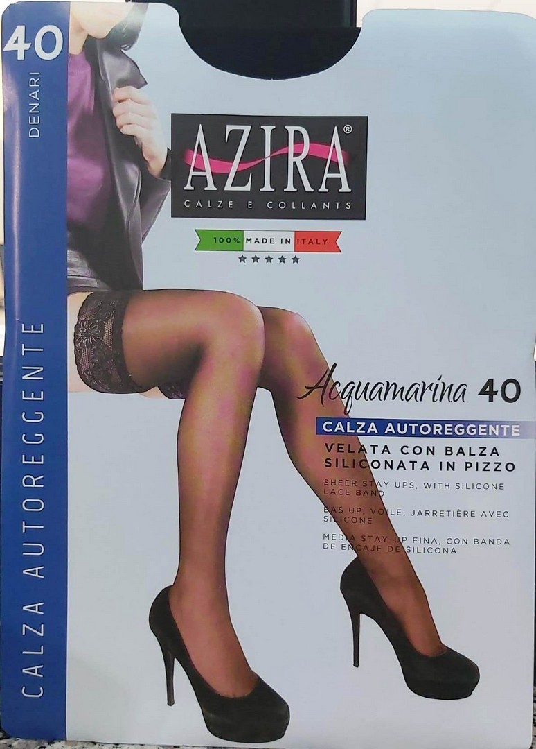 6 PAIA AUTOREGGENTE AZIRA ART ACQUAMARINA 40 DEN AUTOREGGENTE ELASTICIZZATO, OPACO, PER TUTTI I GIORNI, CON BALZA IN PIZZO CON DUE STRISCIE DI SILICONE ALL’INTERNO PER NON FARE SCIVOLARE LA CALZA TAGLIE DISPONIBILI: 1/2 – 3/4 COLORI DISPONIBILI: NERO COMPOSIZIONE DEL PRODOTTO: 87% POLIAMMIDE 13% ELASTAN QUALITA’ AZIRA