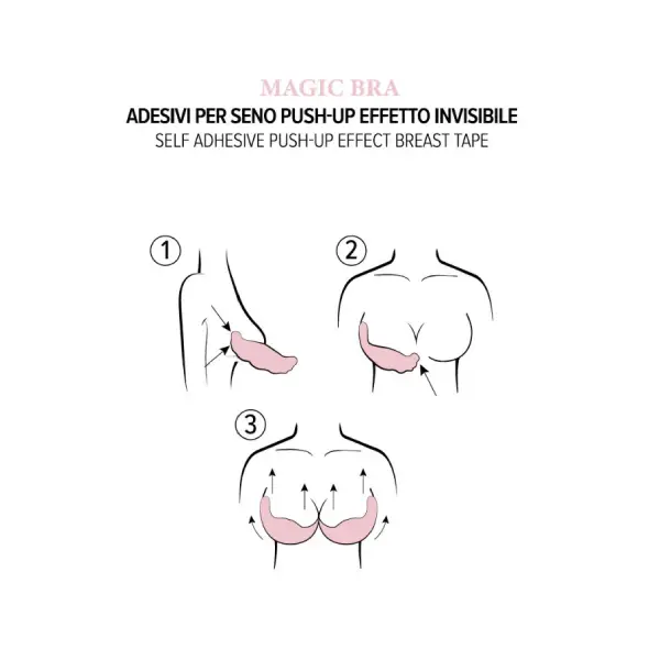 Facili da applicare, le alette Magic Bra richiedono semplici accorgimenti: è fondamentale che la pelle sia completamente asciutta e priva di creme o prodotti cosmetici. Dopo aver rimosso delicatamente la protezione in plastica, l’adesivo va applicato partendo dall’esterno del seno, passando sotto e accompagnando verso l’interno per creare la forma desiderata.