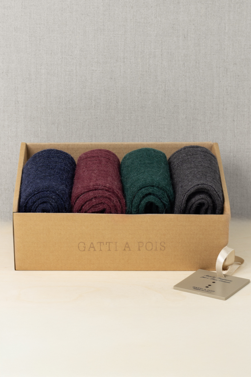 Risparmia con il Box da n.4 Calze Mezzagamba da Uomo pensate per i più freddolosi. Realizzate in Alpaca, il filato più caldo e morbido che Gatti a pois produce, offre comfort e calore eccezionali. La lavorazione artigianale Made in Italy garantisce una morbidezza e una vestibilità uniche, distintive del nostro marchio. In più in questo AlpacaBox avrete la Card Profumata per i vostri cassetti. Personalizzabili con Iniziali Ricamate.