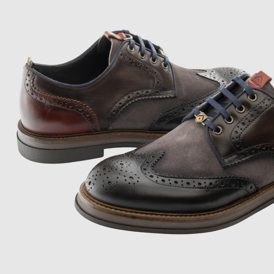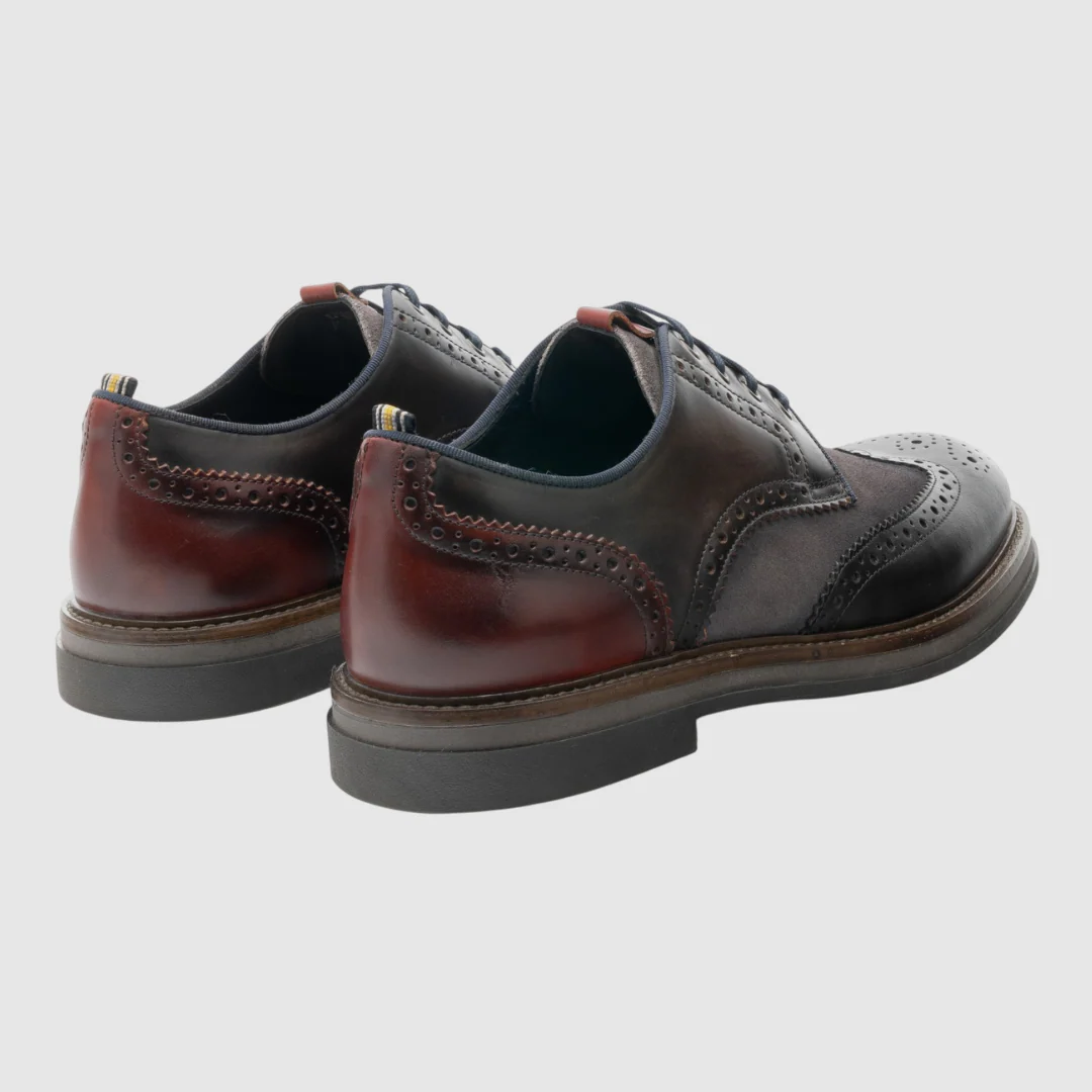 Scarpa stile brogue con dettagli in pelle traforata e suola bicolore. Presenta una combinazione di pelli in tonalità e texture diverse per un look distintivo.