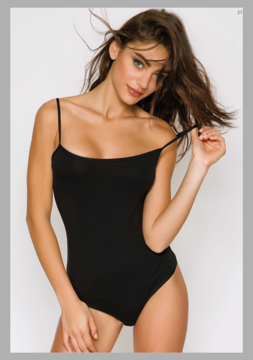 Body donna spalla stretta in morbido cotone elasticizzato. Non imbottito. Senza ferretto. Triplo gancio a 2 posizioni.