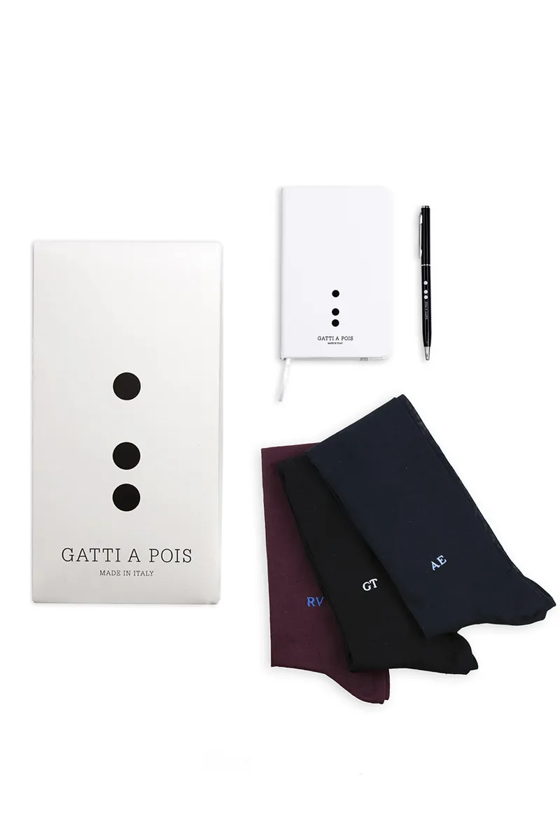 Gatti a Pois vi propone un BOX VERAMENTE SPECIALE composto da: N.3 Paia di Calze da Uomo in PURO FILO DI SCOZIA con le vostre iniziali Ricamate con metodo tradizionale dalla nostra Sarta La lavorazione richiede 3 giorni lavorativi, in più si devono aggiungere le nostre 24/48 ore di Spedizione tramite GLS I Colori delle Calze contenute nel Box sono i seguenti: BluNotte, Bordeaux e Nera (possibile richiedere variabile di un colore) Taccuino e Penna in acciaio per completare il tuo Box..Il Taccuino (fogli bianchi lisci all’interno) e la Penna di Gatti a Pois, un regalo utile e carino da abbinare…