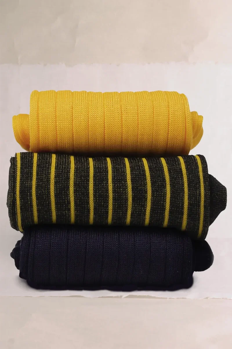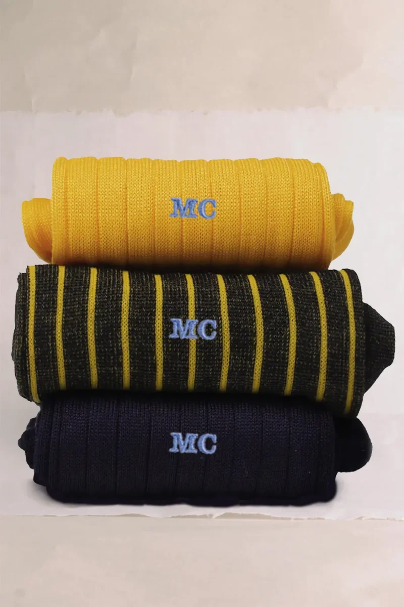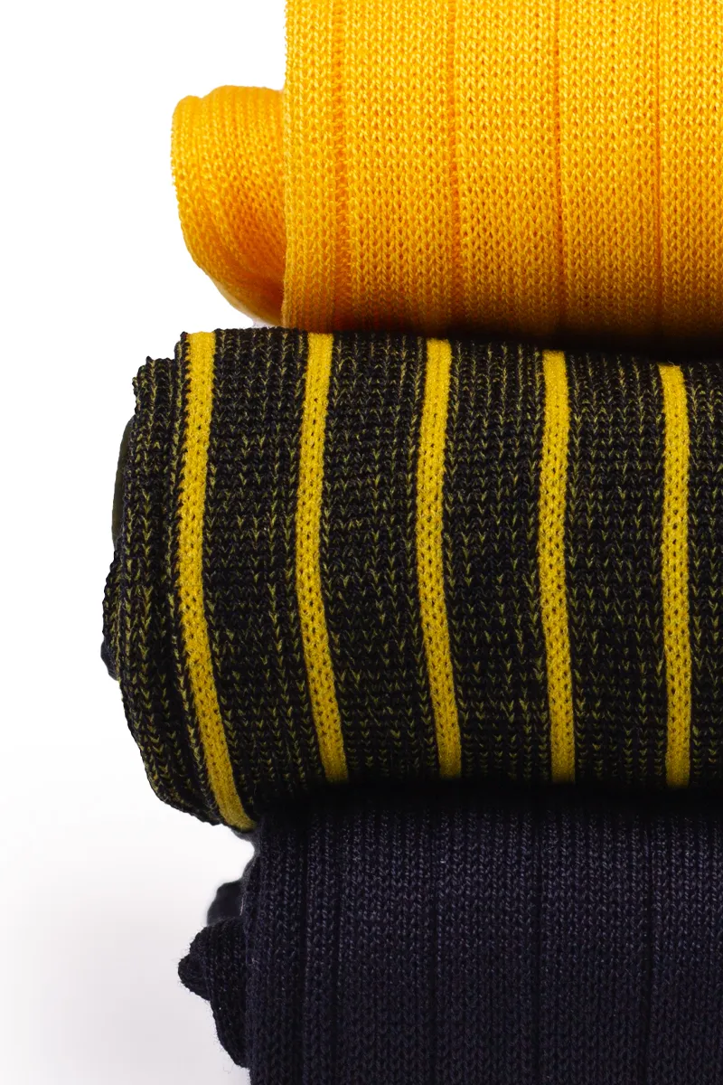 Trittico di Calze da Uomo dai Filati Naturali Pregiati realizzate con Filo di Scozia Giallo Sole e il Classico Blu Notte