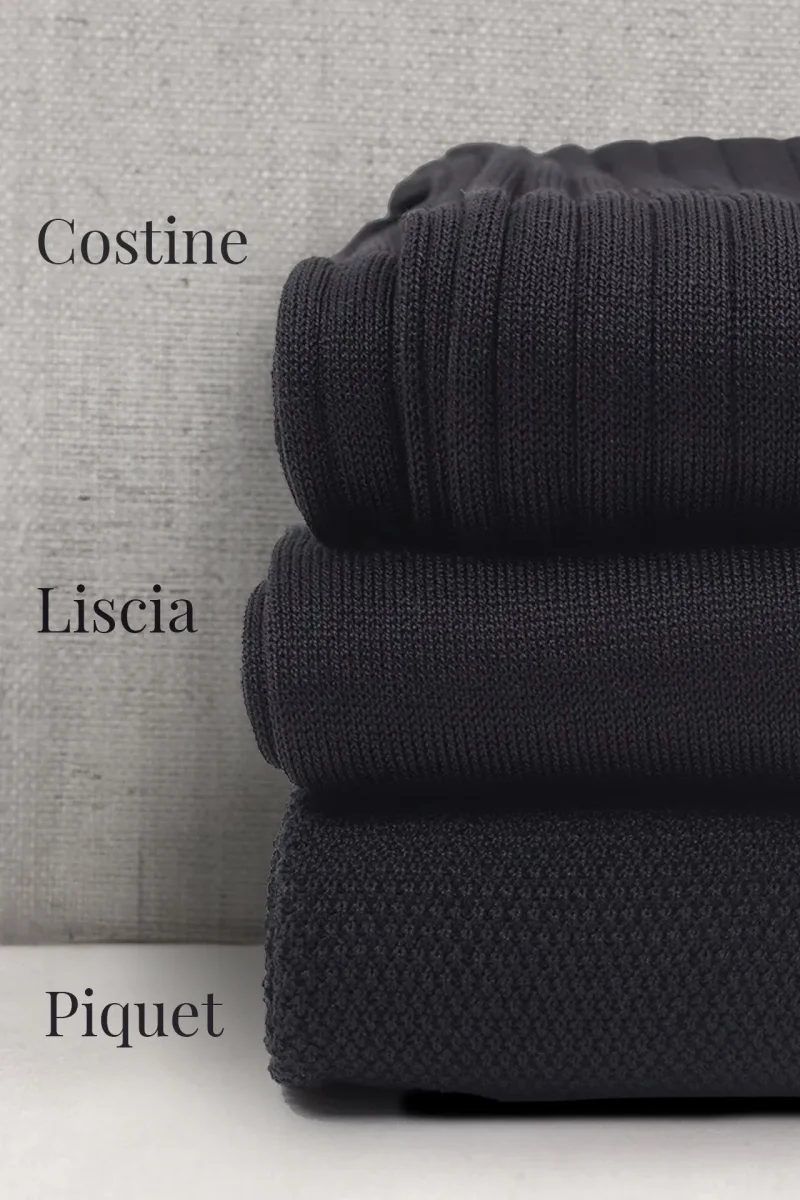 Trittico di Calze da Uomo in Pregiato Filo di Scozia, realizzate con lo stesso Filato ma in tre Lavorazioni differenti. La Liscia, la piu’ leggera delle tre, l’intramontabile Costine e la Piquet, una lavorazione del passato a micro nido d’ape. Potrete personalizzarle con le Vostre Iniziali scegliendo il colore del Ricamo ma anche scrivendo in NOTE variazioni (es: due a costine, 1 Piquet ecc)