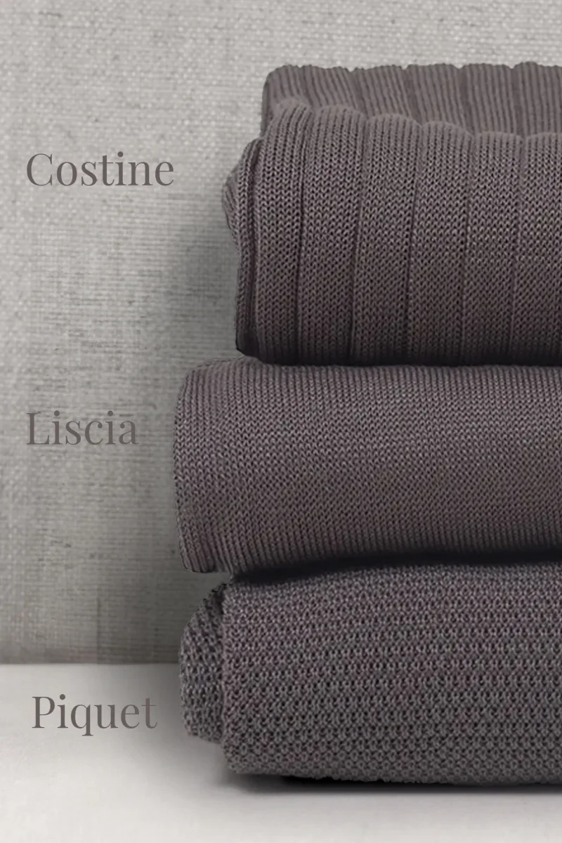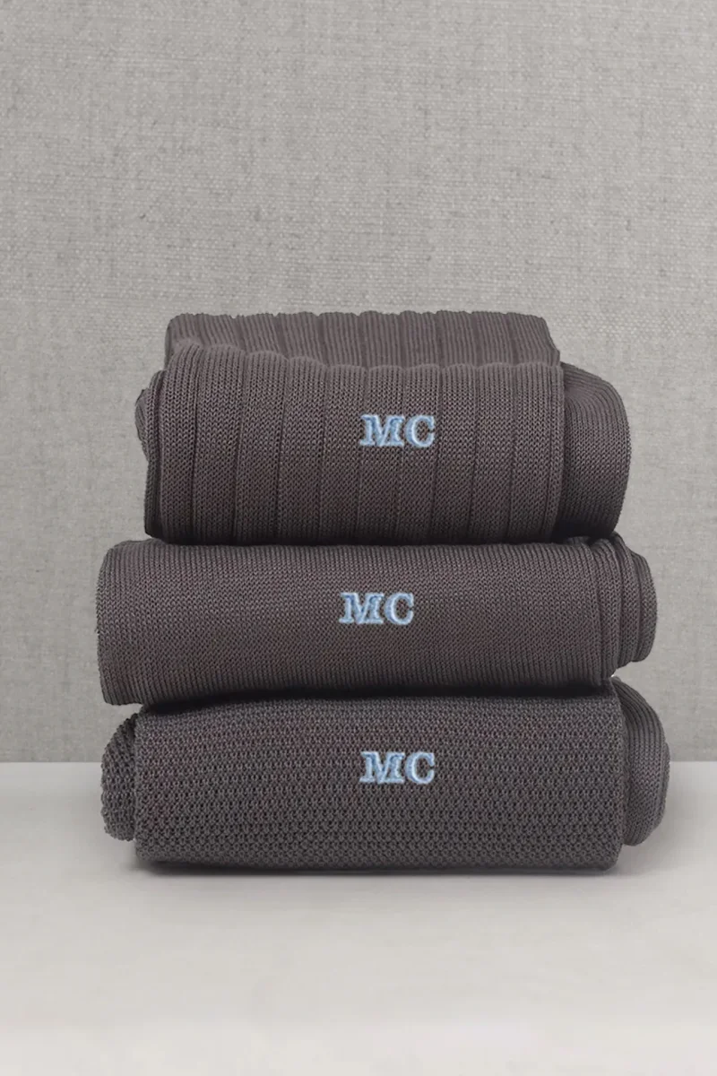 Trittico di Calze da Uomo in Pregiato Filo di Scozia, realizzate con lo stesso Filato ma in tre Lavorazioni differenti. La Liscia, la piu’ leggera delle tre, l’intramontabile Costine e la Piquet, una lavorazione del passato a micro nido d’ape. Potrete personalizzarle con le Vostre Iniziali scegliendo il colore del Ricamo ma anche scrivendo in NOTE variazioni (es: due a costine, 1 Piquet ecc)
