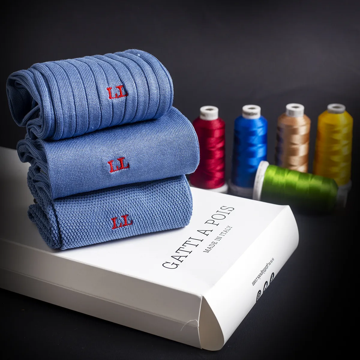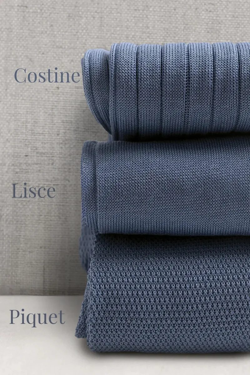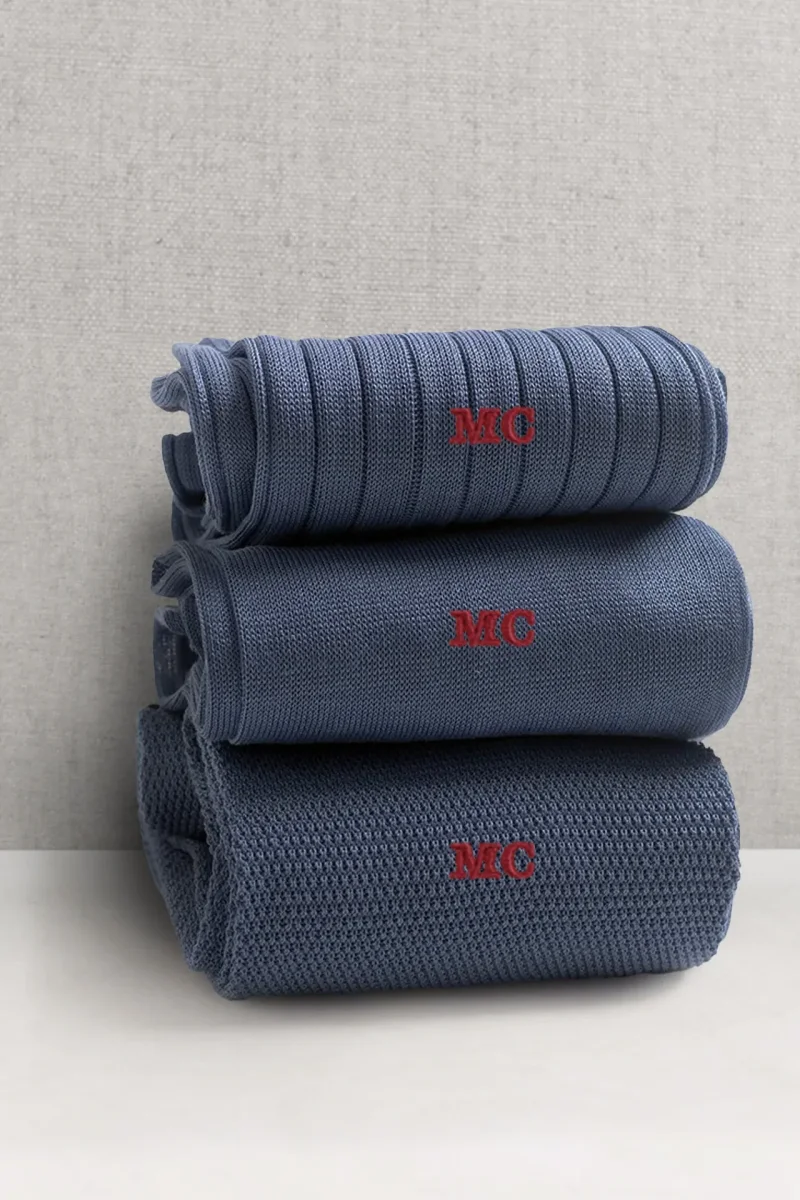Trittico di Calze da Uomo in Pregiato Filo di Scozia, realizzate con lo stesso Filato ma in tre Lavorazioni differenti. La Liscia, la piu’ leggera delle tre, l’intramontabile Costine e la Piquet, una lavorazione del passato a micro nido d’ape. Potrete personalizzarle con le Vostre Iniziali scegliendo il colore del Ricamo ma anche scrivendo in NOTE variazioni (es: due a costine, 1 Piquet ecc)
