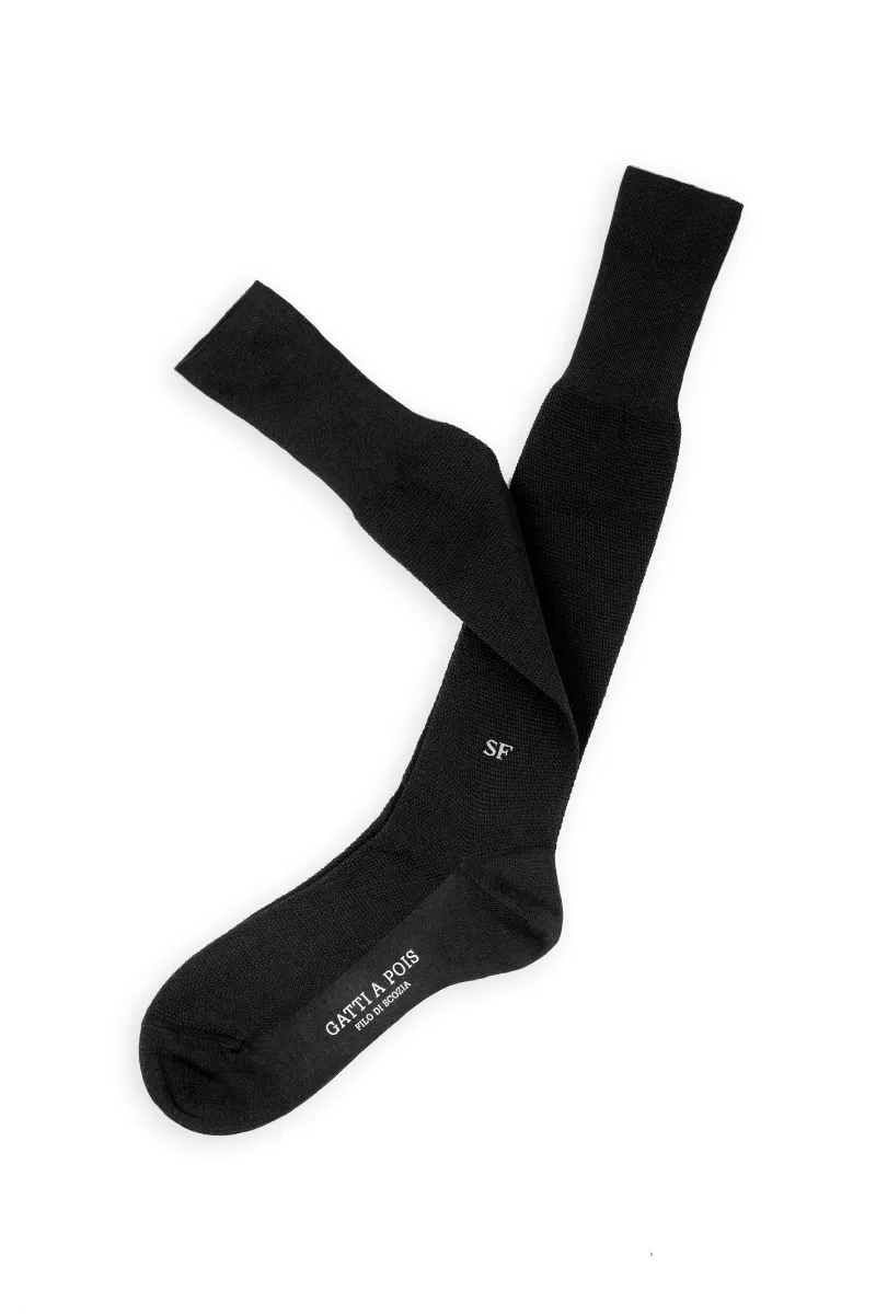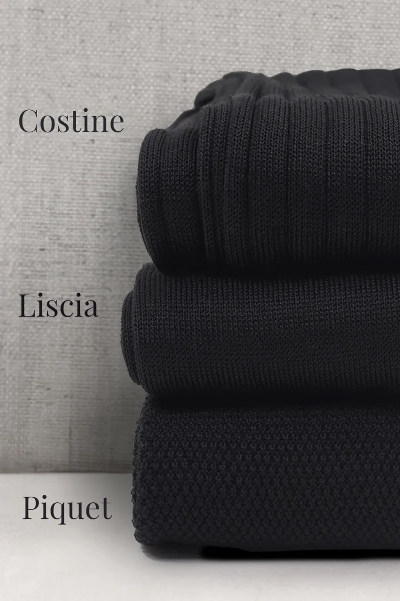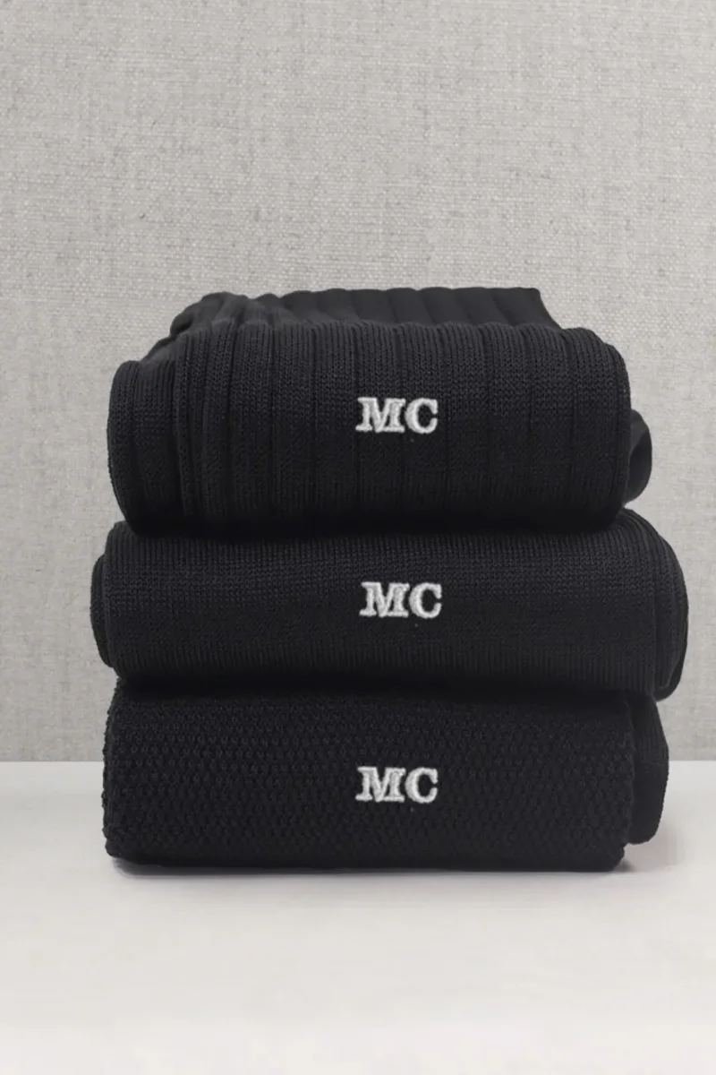 Trittico di Calze da Uomo in Pregiato Filo di Scozia, realizzate con lo stesso Filato ma in tre Lavorazioni differenti. La Liscia, la piu’ leggera delle tre, l’intramontabile Costine e la Piquet, una lavorazione del passato a micro nido d’ape. Potrete personalizzarle con le Vostre Iniziali scegliendo il colore del Ricamo ma anche scrivendo in NOTE variazioni (es: due a costine, 1 Piquet ecc)