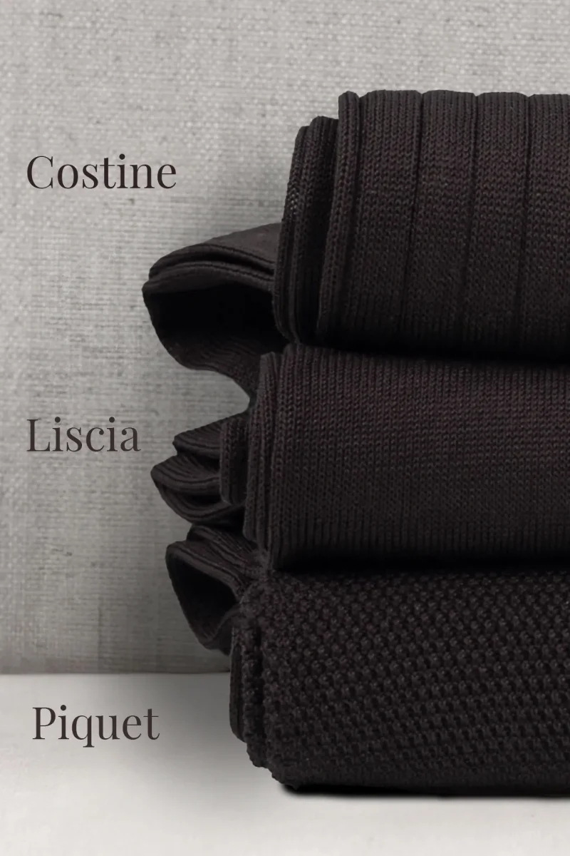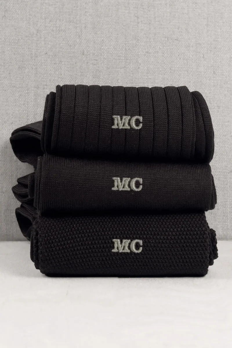 Trittico di Calze da Uomo in Pregiato Filo di Scozia, realizzate con lo stesso Filato ma in tre Lavorazioni differenti. La Liscia, la piu’ leggera delle tre, l’intramontabile Costine e la Piquet, una lavorazione del passato a micro nido d’ape. Potrete personalizzarle con le Vostre Iniziali scegliendo il colore del Ricamo ma anche scrivendo in NOTE variazioni (es: due a costine, 1 Piquet ecc)