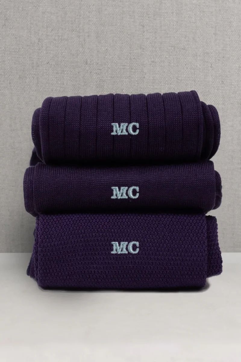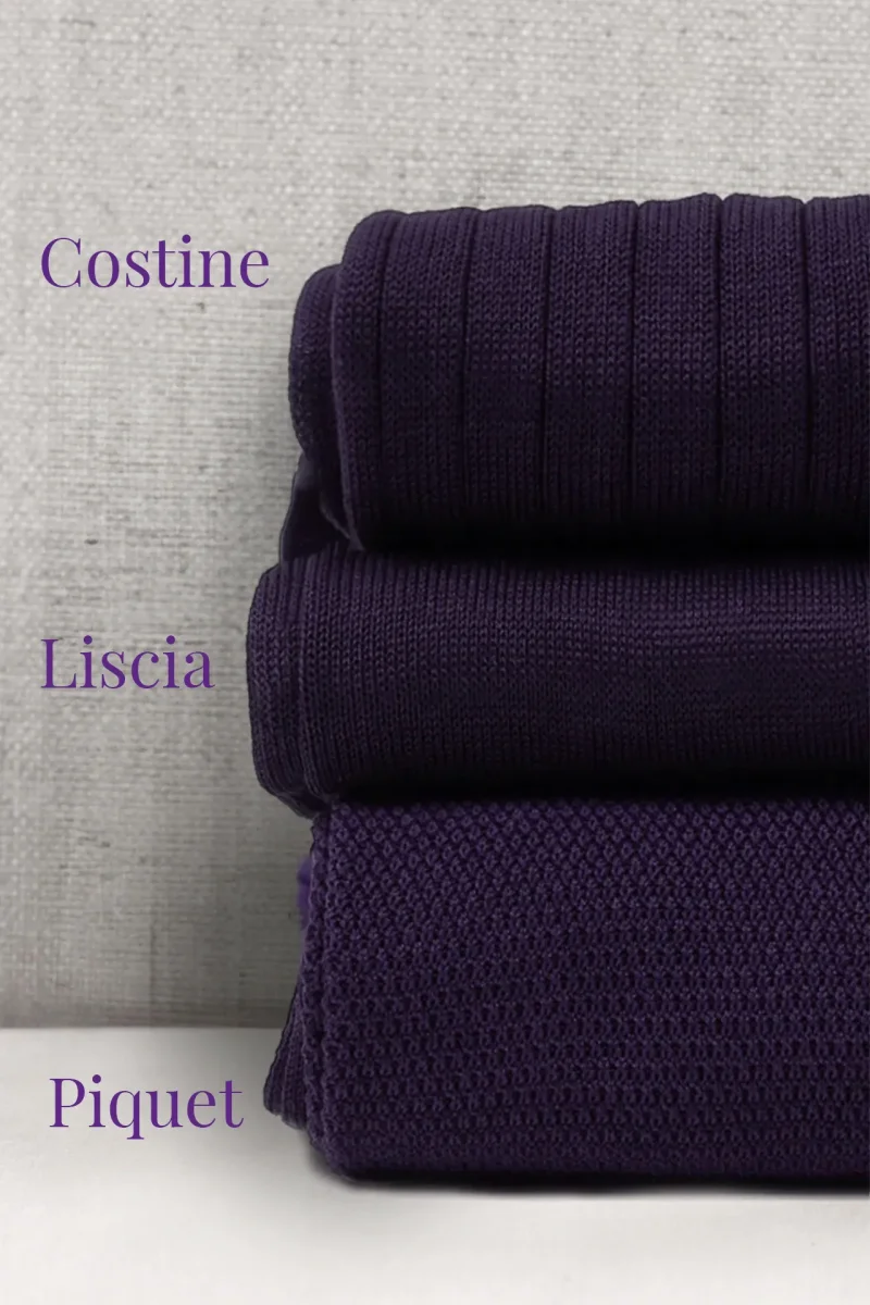 Trittico di Calze da Uomo in Pregiato Filo di Scozia, realizzate con lo stesso Filato ma in tre Lavorazioni differenti. La Liscia, la piu’ leggera delle tre, l’intramontabile Costine e la Piquet, una lavorazione del passato a micro nido d’ape. Potrete personalizzarle con le Vostre Iniziali scegliendo il colore del Ricamo ma anche scrivendo in NOTE variazioni (es: due a costine, 1 Piquet ecc)