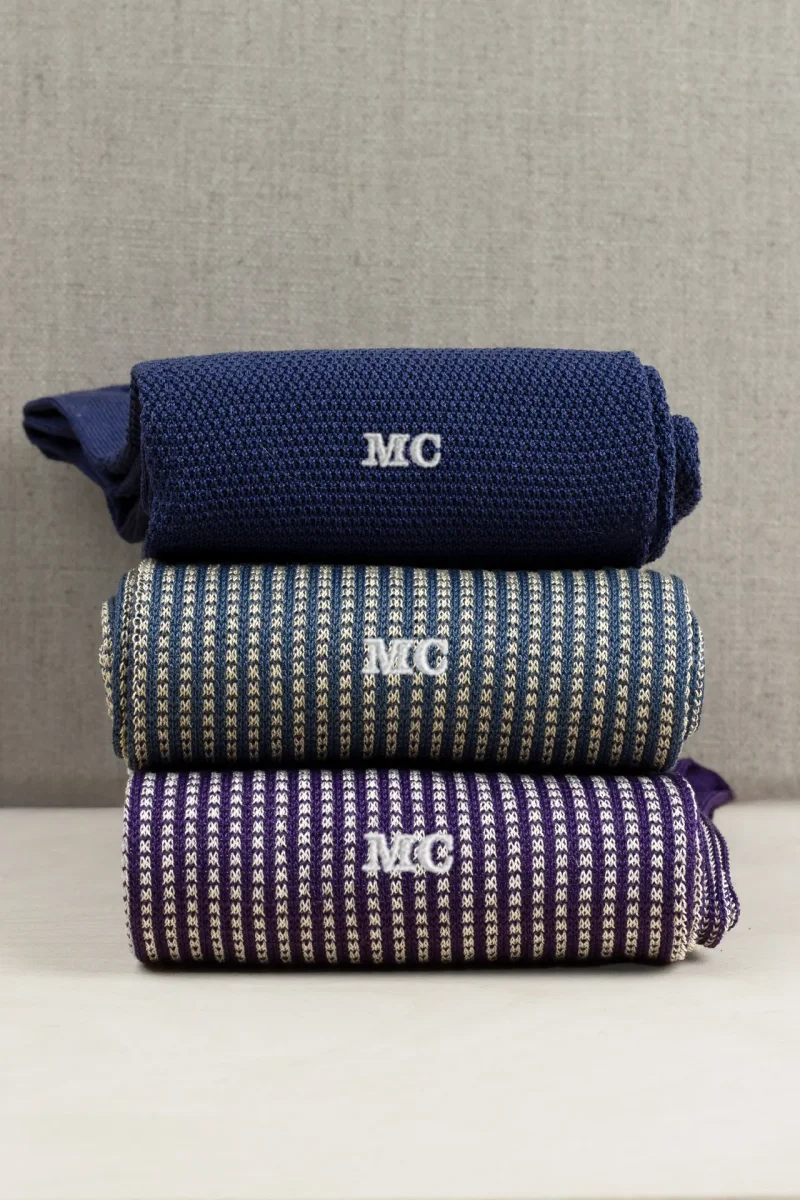 TIPOLOGIA: BOX 3 CALZE LUNGHE con Iniziali Ricamate o Senza! MATERIALE: FILO DI SCOZIA COLORE: English Man Blu Marine, Miniquadri Avio&Tortora, Miniquadri Uva&Perla Potrete inoltre decidere se acquistarle Semplici oppure personalizzate con il Ricamo fatto artigianalmente dalle nostre Sarte. TIPI DI RICAMO tra cui scegliere in tendina: Scopri di più Siete Pregati di verificare in fase di Ordine di avere inserito le INIZIALI ESATTE. La lavorazione richiede al massimo 5 giorni lavorativi, in più si devono aggiungere 24/48 h per la spedizione Per Mantenere la Bellezza e la Morbidezza di queste Calze e dei loro Disegni, si consiglia di lavare a massimo…