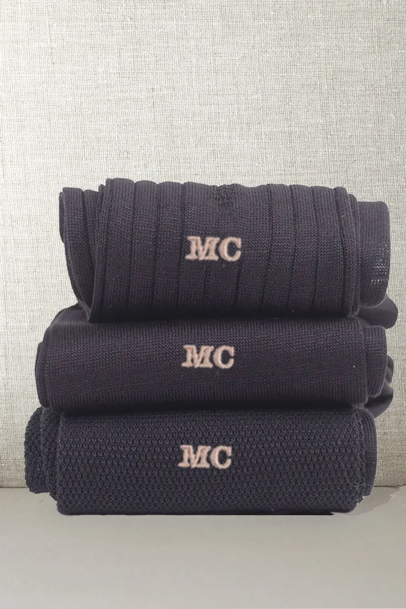 Trittico di Calze da Uomo in Pregiato Filo di Scozia Mezzagamba, realizzate con lo stesso Filato ma in tre Lavorazioni differenti. La Liscia, la piu’ leggera delle tre, l’intramontabile Costine e la Piquet, una lavorazione del passato a micro nido d’ape. Potrete personalizzarle con le Vostre Iniziali scegliendo il colore del Ricamo ma anche scrivendo in NOTE variazioni (es: due a costine, 1 Piquet ecc)
