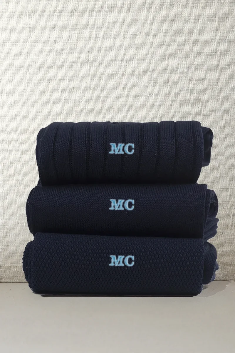 Trittico di Calze da Uomo in Pregiato Filo di Scozia Mezzagamba, realizzate con lo stesso Filato ma in tre Lavorazioni differenti. La Liscia, la piu’ leggera delle tre, l’intramontabile Costine e la Piquet, una lavorazione del passato a micro nido d’ape. Potrete personalizzarle con le Vostre Iniziali scegliendo il colore del Ricamo ma anche scrivere in NOTE variazioni (es: due a costine, 1 Piquet ecc)