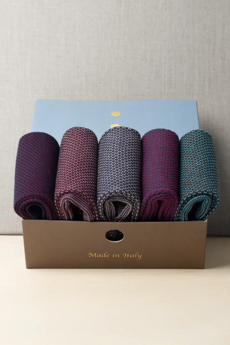 Raffinatezza ed Eleganza per chi acquista questo box Composto da N 5 di Calze dai Filati Naturali Pregiati. Il design Puntinato dona un tocco gioioso e affascinante ai Vostri Outfit. Personalizzabile con le Vostre Iniziali.