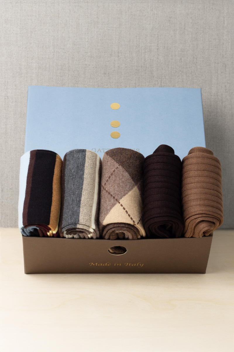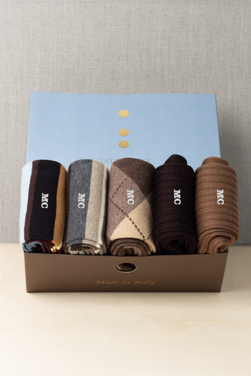 In questa Box troverete N.5 Paia di Calze nei toni del Marrone e della Natura, un accostamento intramontabile che racconta l’Eleganza Italiana. N.3 paia in Caldo Cotone per le giornate più fresche e n.2 in Puro Filo di Scozia. Il Ricamo delle Tue Iniziali sarà il tocco di Classe in più se lo desideri.