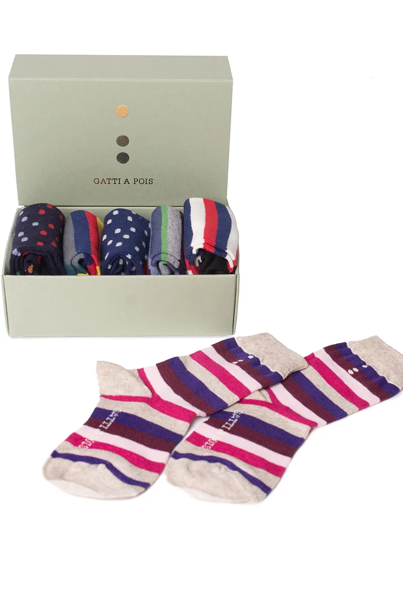 Box composto da N.5 Paia di Calze da BIMBA Mezzagamba Fantasie Miste in Cotone Made in Italy che potrai anche personalizzare con le sue Iniziali o col suo Nome! Calza da bambina a 3/4, realizzate artigianalmente in Italia con cotone pettinato sempre italiano. Pattern a RIGHE o a POIS dai colori allegri e decisi. COMPOSIZIONE: 80% Cotone 17%Poliammide 3% Elastan Manutenzione: lavare a mano o in lavatrice temperatura massimo 40º. NON UTILIZZARE ASCIUGATRICE. Non stirare. Le Calze di Gatti a Pois sono ideate e realizzate per i nostri bambini. Sono stati utilizzati filati di primissima scelta e totalmente Made in…