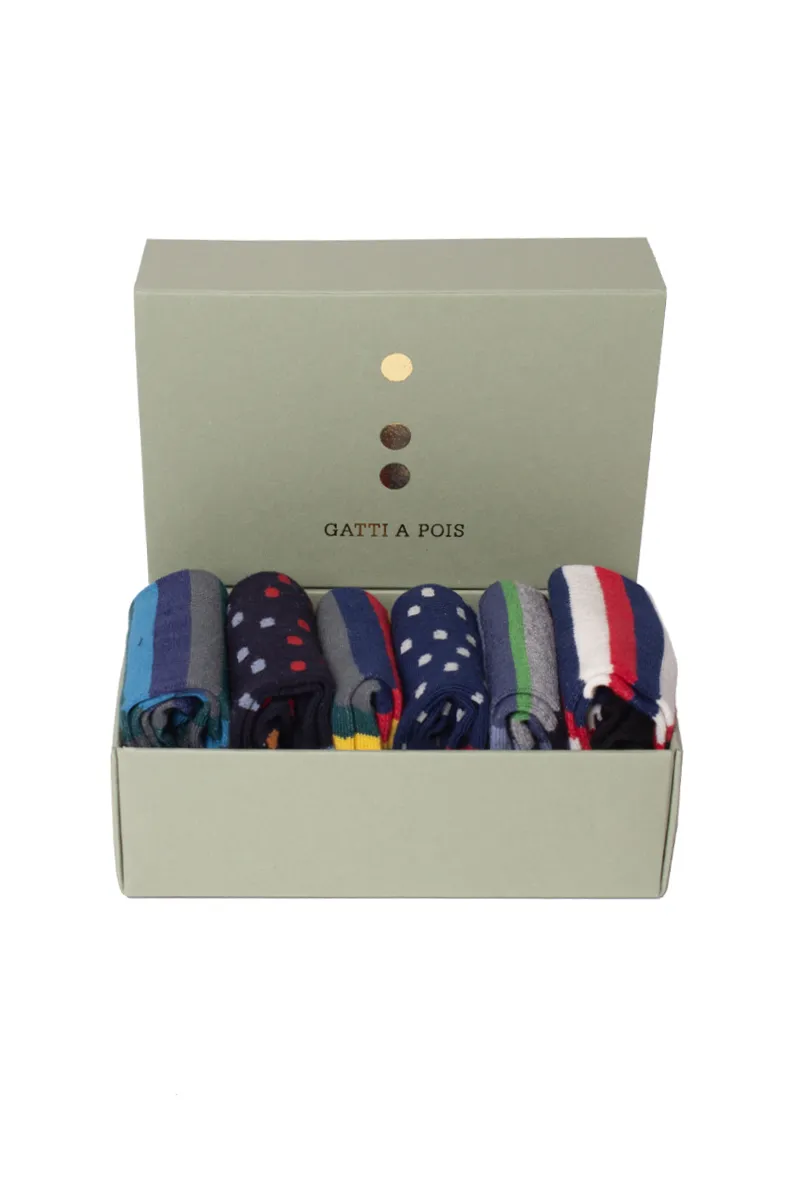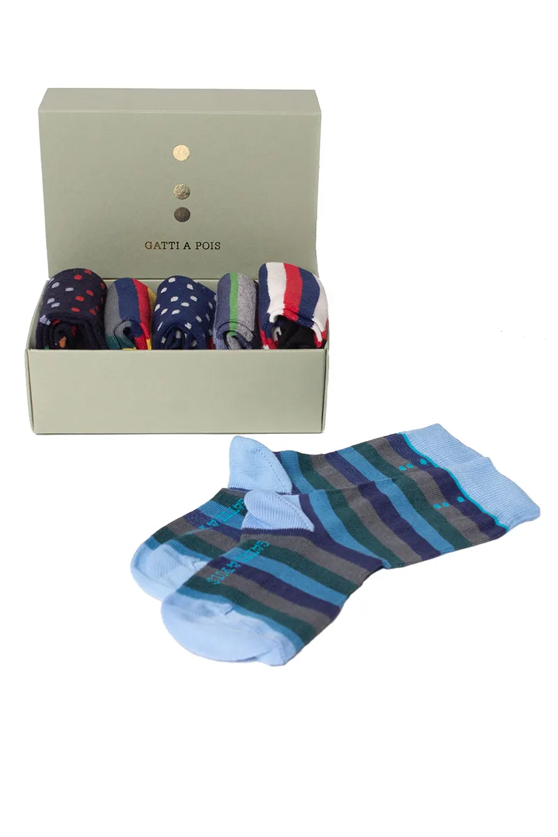 Box composto da N.5 Paia di Calze da BIMBO Mezzagamba Fantasie Miste in Cotone Made in Italy che potrai anche personalizzare con le sue Iniziali o col suo Nome! Calza da bambino a 3/4, realizzate artigianalmente in Italia con cotone pettinato sempre italiano. Pattern a RIGHE o a POIS dai colori allegri e decisi. COMPOSIZIONE: 80% Cotone 17%Poliammide 3% Elastan Manutenzione: lavare a mano o in lavatrice temperatura massimo 40º. NON UTILIZZARE ASCIUGATRICE. Non stirare. Le Calze di Gatti a Pois sono ideate e realizzate per i nostri bambini. Sono stati utilizzati filati di primissima scelta e totalmente Made in…