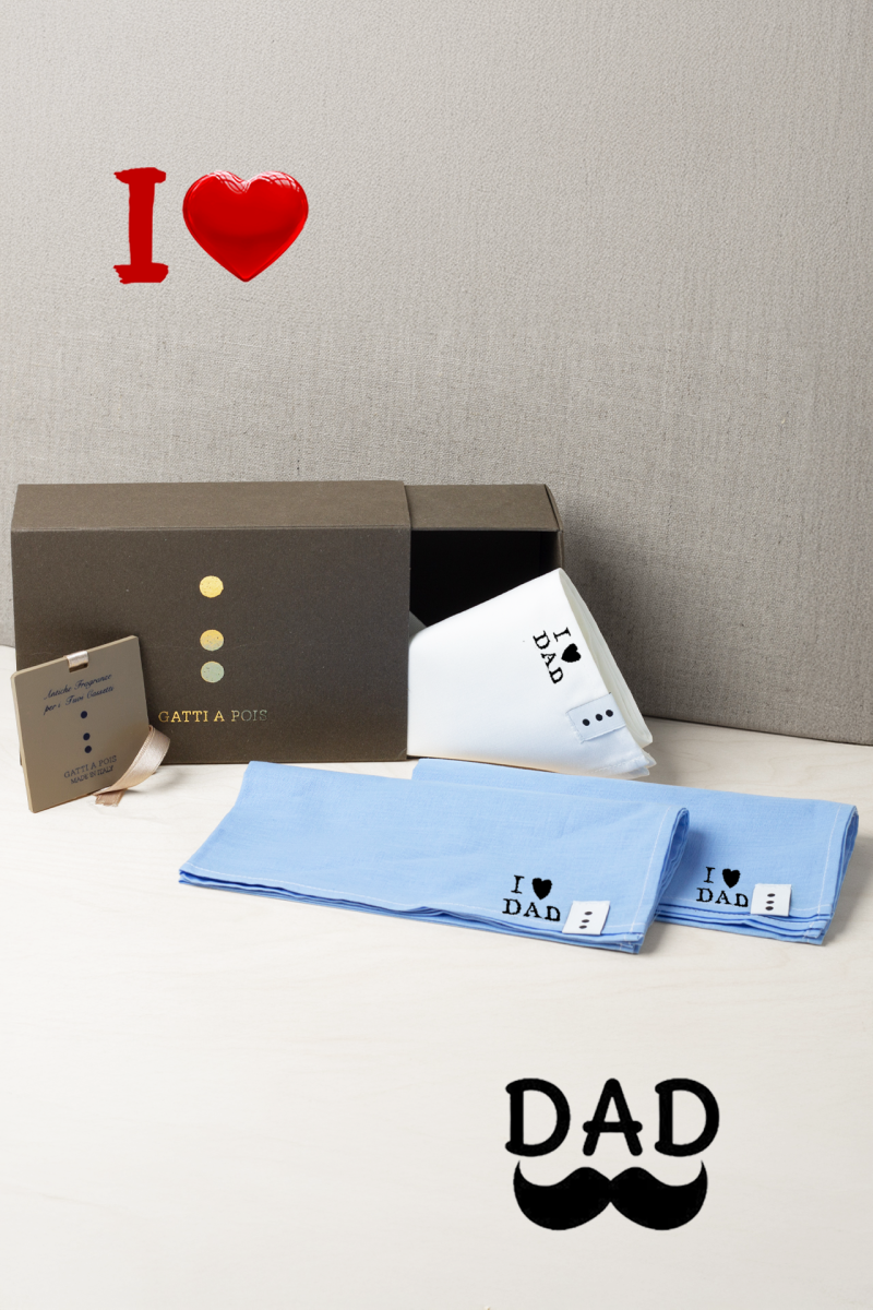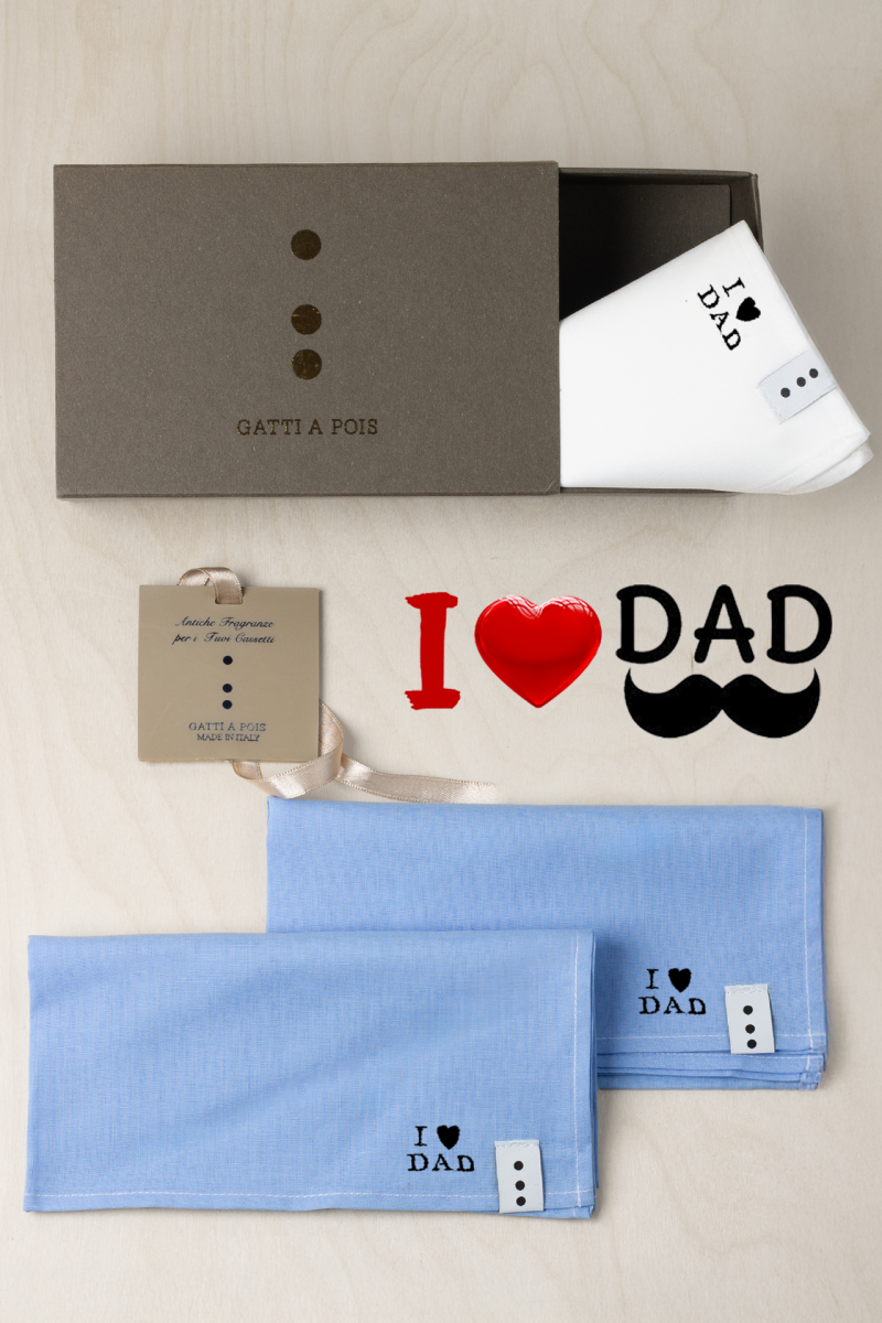 Il tuo Papà è un Uomo che ama il Classico e il Made in Italy? Vuoi fargli un Regalo che ogni giorno gli farà ricordare del tuo Amore? Ecco la Box Regalo che lo sorprenderà. I nostri Fazzoletti di Cotoni Italiani che potrai personalizzare con le sue iniziali con la scritta I LOVE DAD per trasmettergli tutto il tuo Amore. In più nella Box troverai la CARD PROFUMATA per cassetti con la fragranza Floreale Speziata di gran Classe e il Bigliettino che potrai personalizzare