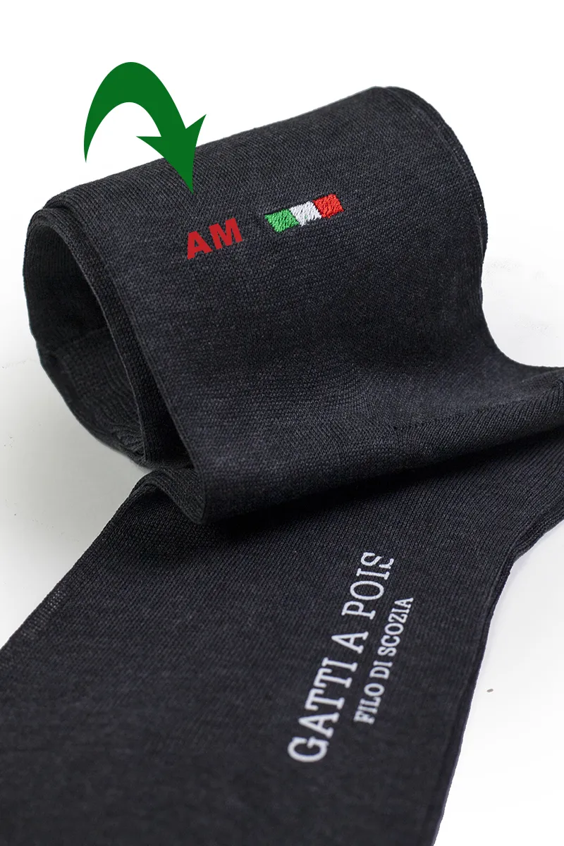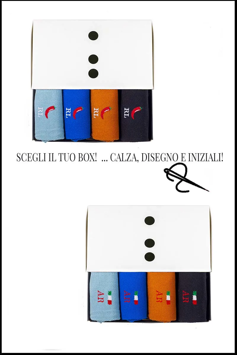 Cofanetto a Cassetto composto da 4 Calze in Puro Filo di Scozia a Lavorazioni Piquet. Calze Top Quality Made in Italy, realizzate con Filati ITALIANI Monticolor. Il Ricamo è realizzato con metodo tradizionale dalla nostra Sarta, La Bandiera Italiana, il Peperoncino e le Vostre iniziali sono realizzate con Fili Bianco Rosso e Verde La lavorazione richiede 3 giorni lavorativi, in più si devono aggiungere le nostre 24/48 ore di Spedizione tramite GLS TIPOLOGIA: N.4 CALZE LUNGHE DA UOMO Lavorazioni Piquet MATERIALE: FILO DI SCOZIA PURO Per i Box Ricamati, è Possibile cambiare 2 colori di Calze, visionandoli nel Reparto Filo…