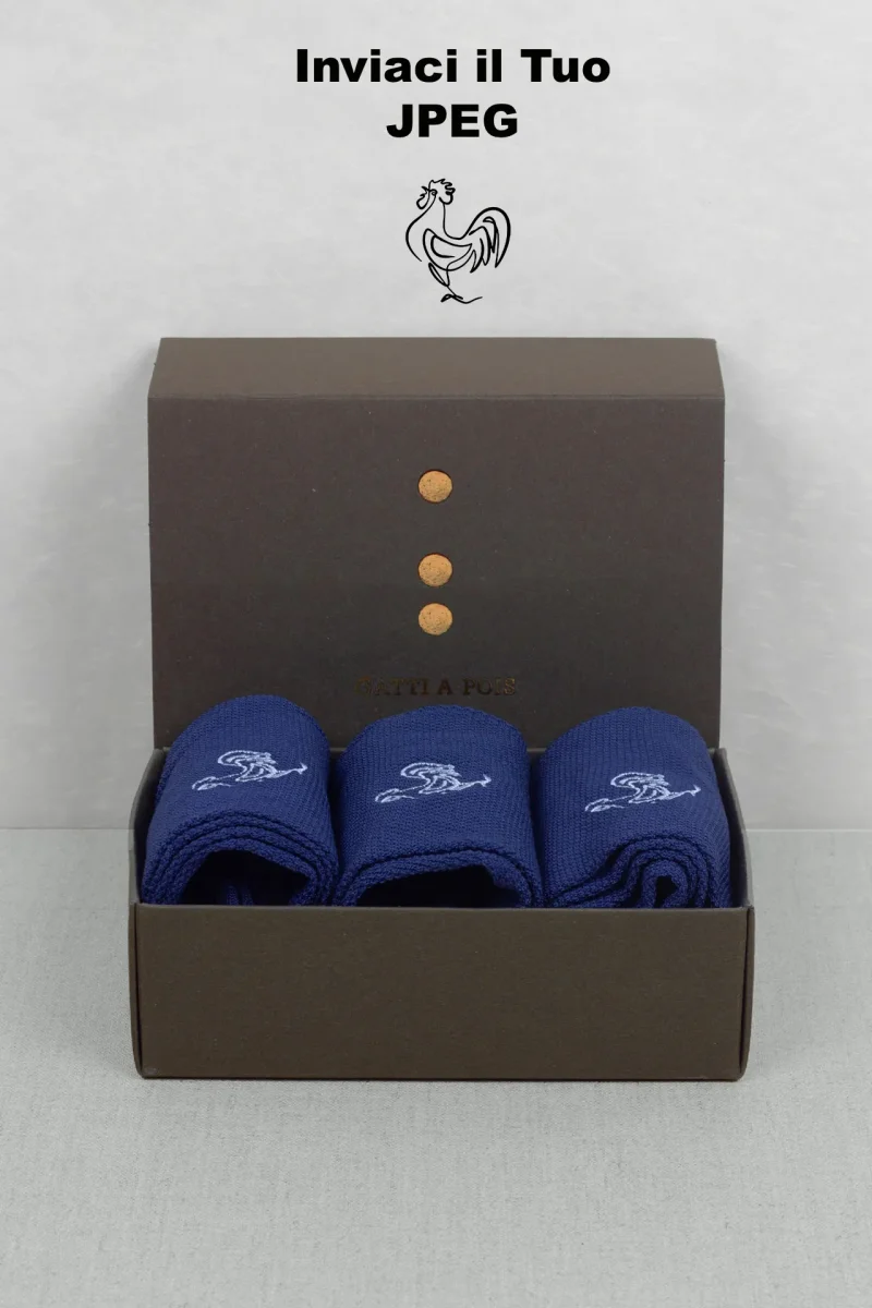 Ecco il Box da N.3 Paia di Calze PERSONALIZZATE! La Novitร che solo Gatti a Pois ha creato per Te! Scegli il Tipo di Calze che piรน ami, preparati il File Jpeg di un disegno o Logo a tua scelta (puoi anche fare uno screenshot da cellulare), allegalo e Noi ricameremo per te LE TUE CALZE UNICHE AL MONDO!