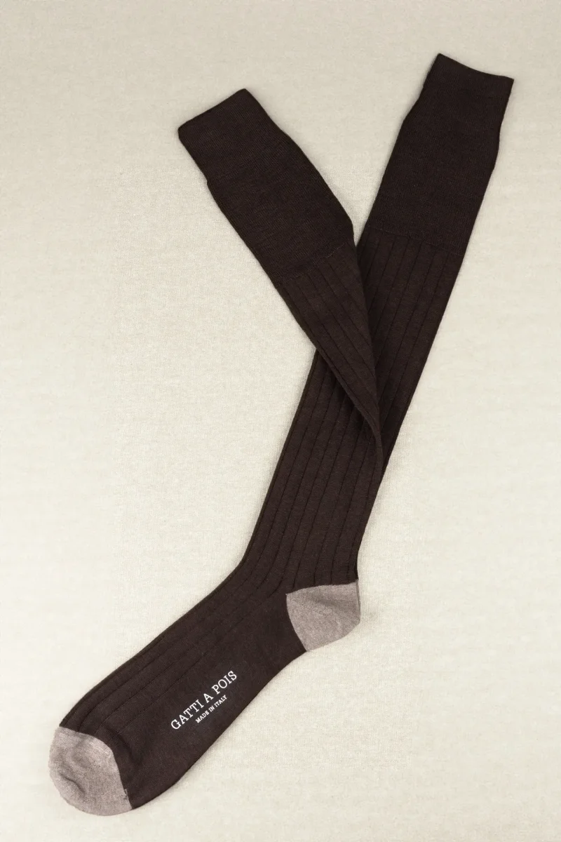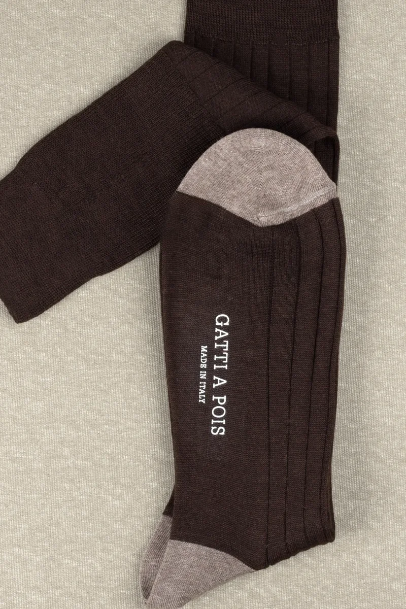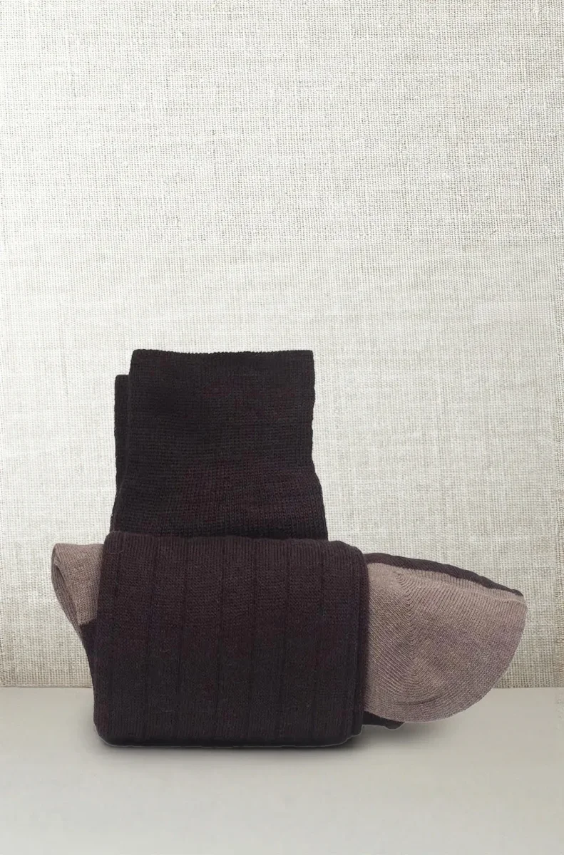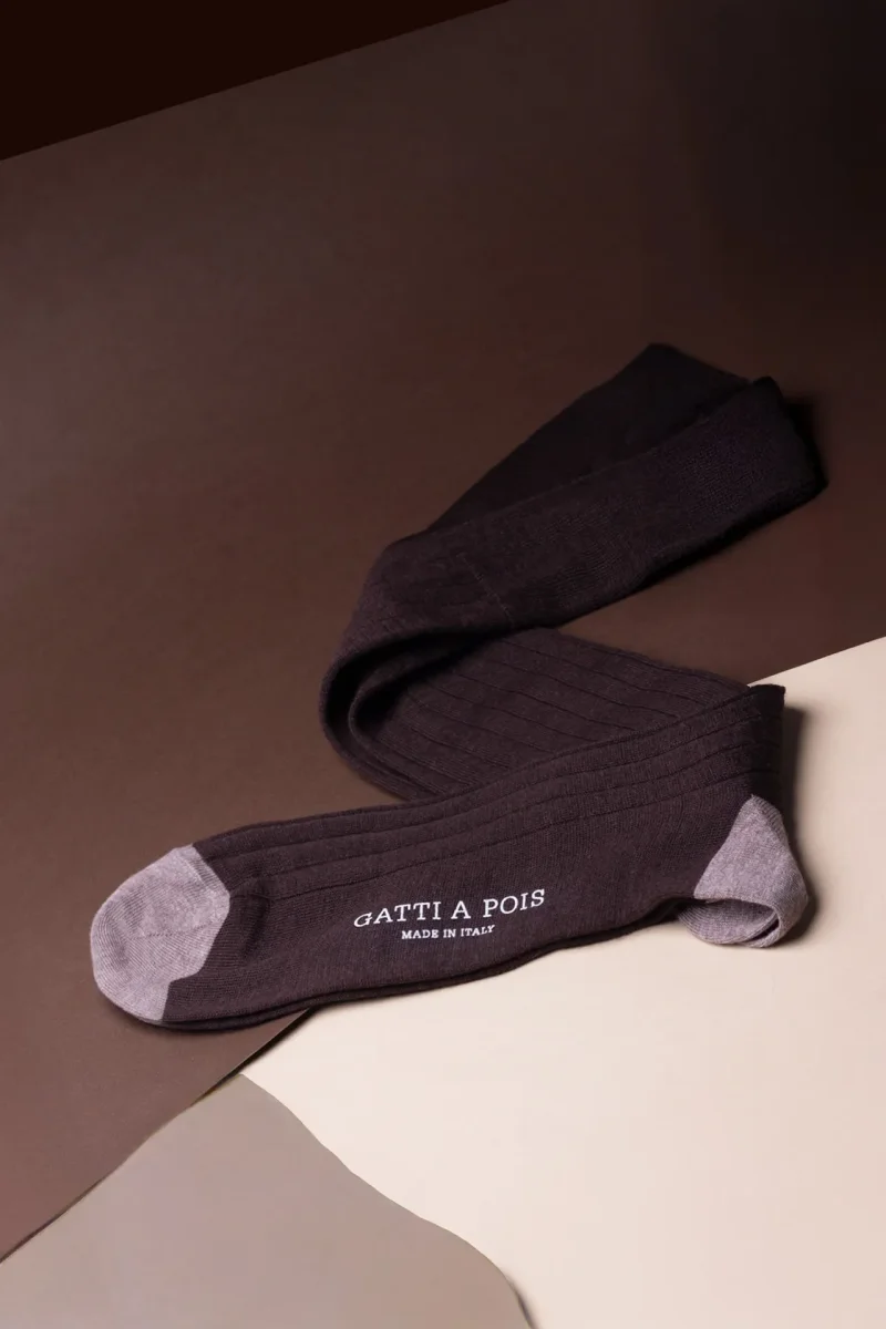 Calze in Lana e Cachemire CALDE ma allo stesso tempo fini, per non rinunciare all’Eleganza ma godere del calore della Lana morbidissima Made in Italy. Lavorazione a Costine e rimagliate a mano. Vestibilitร perfetta e ideale per i Gentlemen contemporanei.