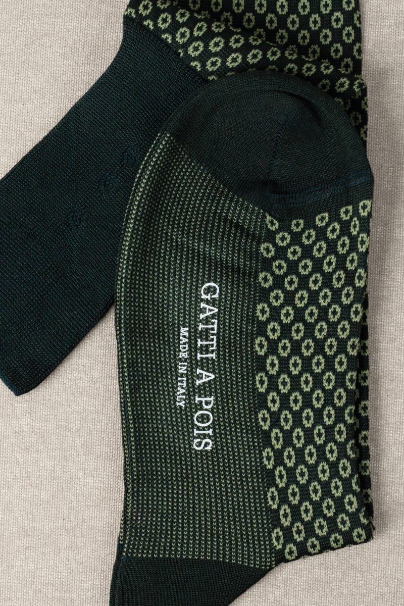 Calze in Filo di Scozia a lavorazione Jacquard con Microbolle a contrasto, realizzate su macchine artigianali 216 aghi. Lavorazione di massima precisione e Must di Eleganza Made in Italy, personalizzabili con Iniziali Ricamate.