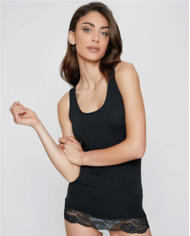Canotta a spalla larga con pizzo in cotone modal elasticizzato. Canotta spalla larga con raffinato bordo in pizzo lavorato a motivo floreale alta 7 cm. Realizzata in morbido cotone elasticizzato. E' possibile indossarla sia per uso interno (canotta intima), sia per uso esterno come sottogiacca. Composizione: CO45 MD45 EA10