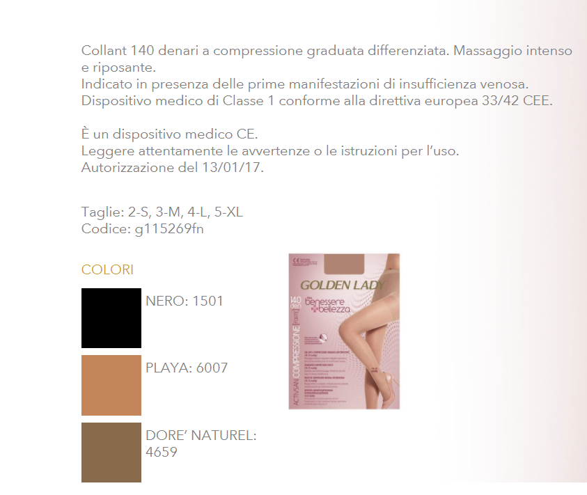 COLLANT GOLDEN LADY ART. BENESSERE + BELLEZZA 70 COLLANT DONNA A COMPRESSIONE GRADUATA DIFFERENZIATA ( MMHG 15-17 ) TALLONE ANATOMICO RINFORZATO MASSAGGIO INTENSO E RIPOSANTE INDICATO IN PRESENZA DELLE PRIME MANIFESTAZIONI DI INSUFFICENZA VENOSA CORPINO CONTENITIVO EFFETTO PANCIA PIATTA ED ELEGANTE BORDINO RICAMATO TAGLIE DISPONIBILI: 2-S 3-M 4-L 5-XL COLORI DISPONIBILI: PLAYA-NERO-DORE NATUREL QUALITA’ GOLDEN LADY