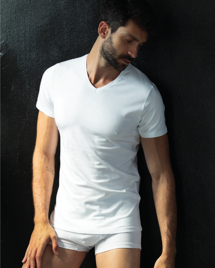 T-shirt uomo in morbido cotone bielastico con scollo a V piatto esternabile in tinta unita