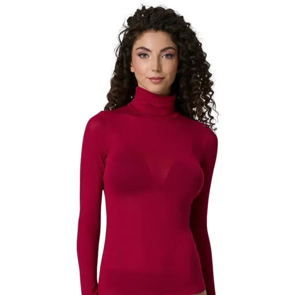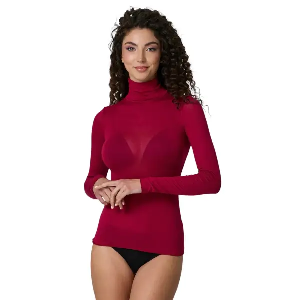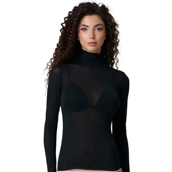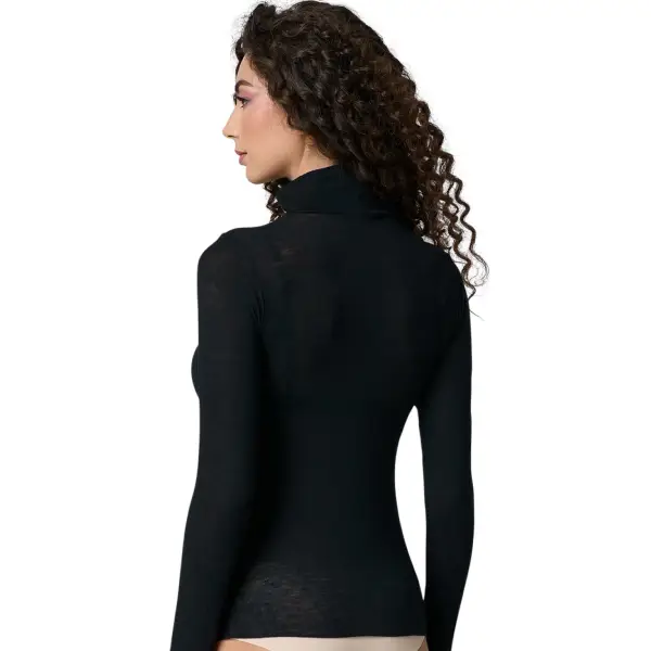 Il collo alto protegge dal freddo con naturale eleganza. Inoltre, la struttura elasticizzata segue le forme del corpo creando un delicato effetto seconda pelle. Il risultato è una maglia avvolgente, perfetta sia come intimo termico sia come capo protagonista del look quotidiano.