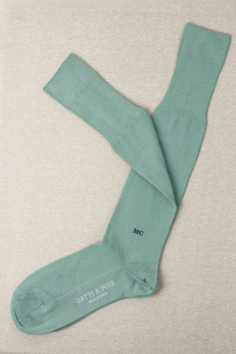 Calze in Puro Filo di Scozia a Lavorazione Piquet (micro nido d’ape) di Alta qualitร Made in Italy rimagliate a mano. Vestibilitร perfetta e ideale per i Gentlemen contemporanei. Personalizzabili con Iniziali.