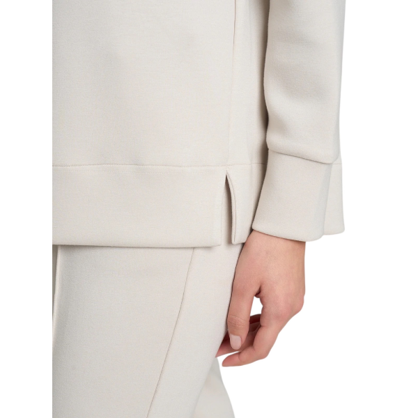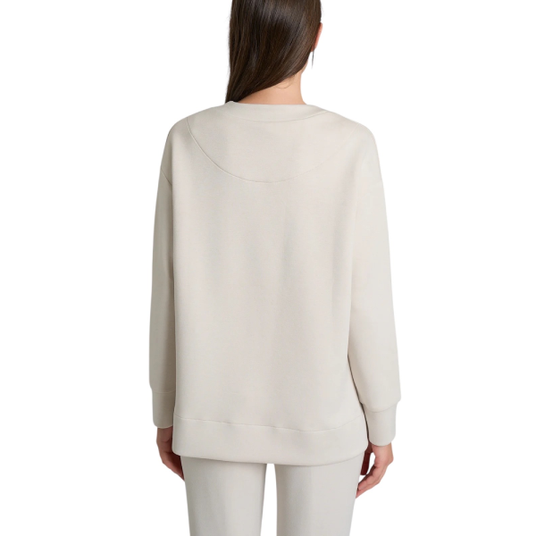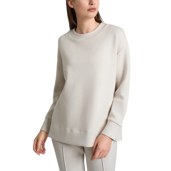 Il design è caratterizzato da un girocollo classico, che esalta le linee essenziali e rende questa felpa facile da abbinare a qualsiasi outfit. Le maniche lunghe con polsini garantiscono comodità e praticità, mentre i delicati spacchetti laterali aggiungono dinamismo e fluidità alla linea, semplificando al tempo stesso l’indosso.