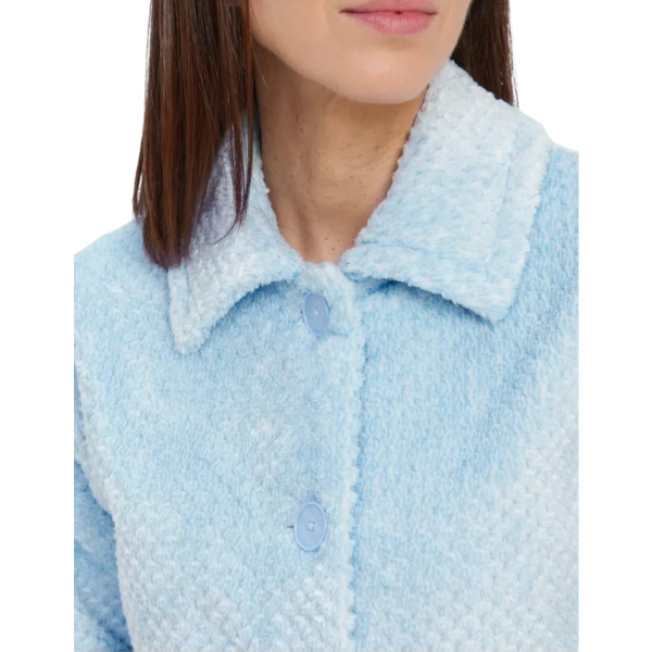 Vestaglia donna corta abbottonata Lohe in tessuto jacquard con colletto classico e tasche laterali. Calda, pratica ed elegante per il relax quotidiano.