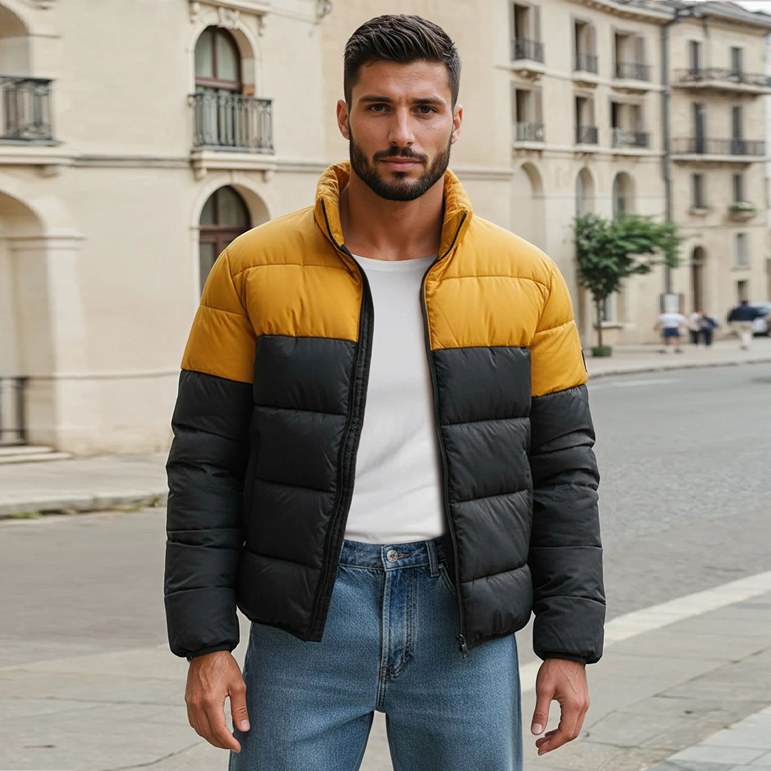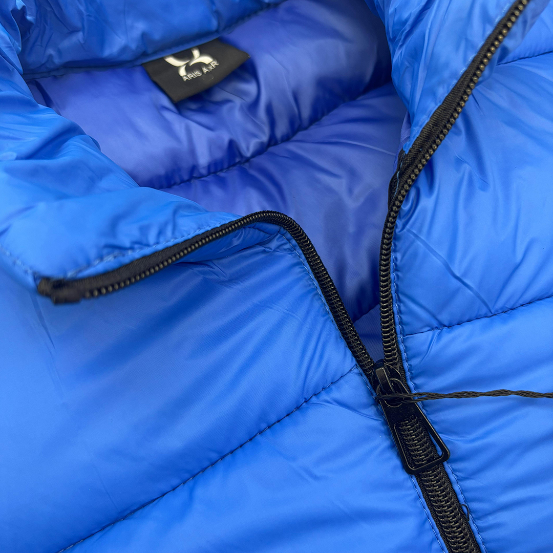 Giubbino uomo 300 grammi Aris AXR in versione bicolore con logo sulla manica. Dotato di due tasche interne e imbottitura in 100% piumino di cotone. Disponibile in nero/blu, nero/bluette, nero/bronzo, nero/ocra.