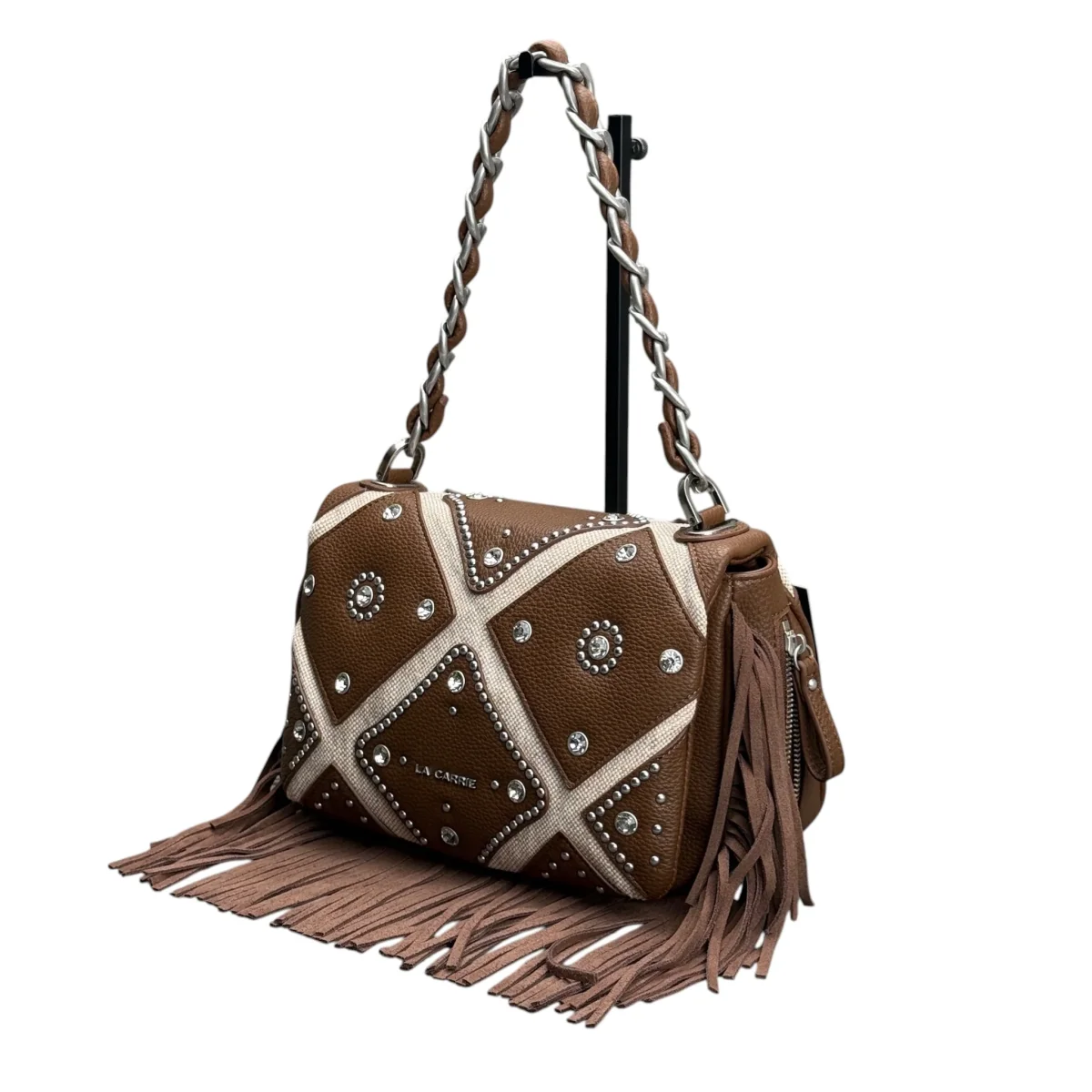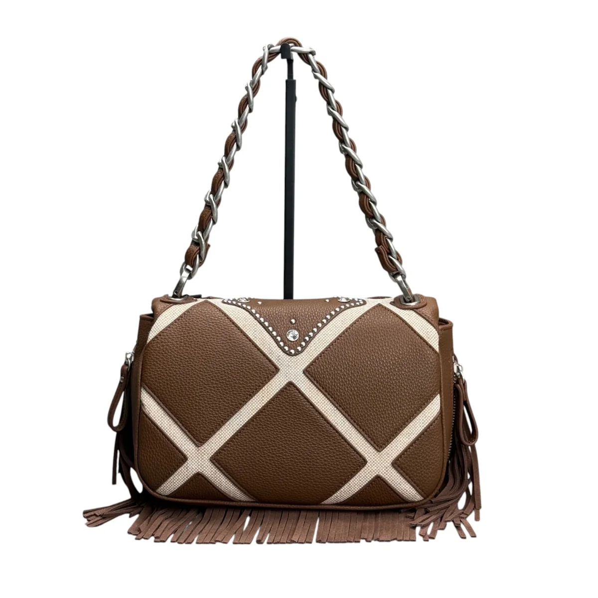 Dettagli prodotto: Borsa a spalla in PU e canvas Lavorazione a rombi cuciti decorati da strass e borchie Manico in catena infilato in PU e tracolla rimovibile Dimensioni: 32x13x19cm Codice: 161M-BZ-441-CAS