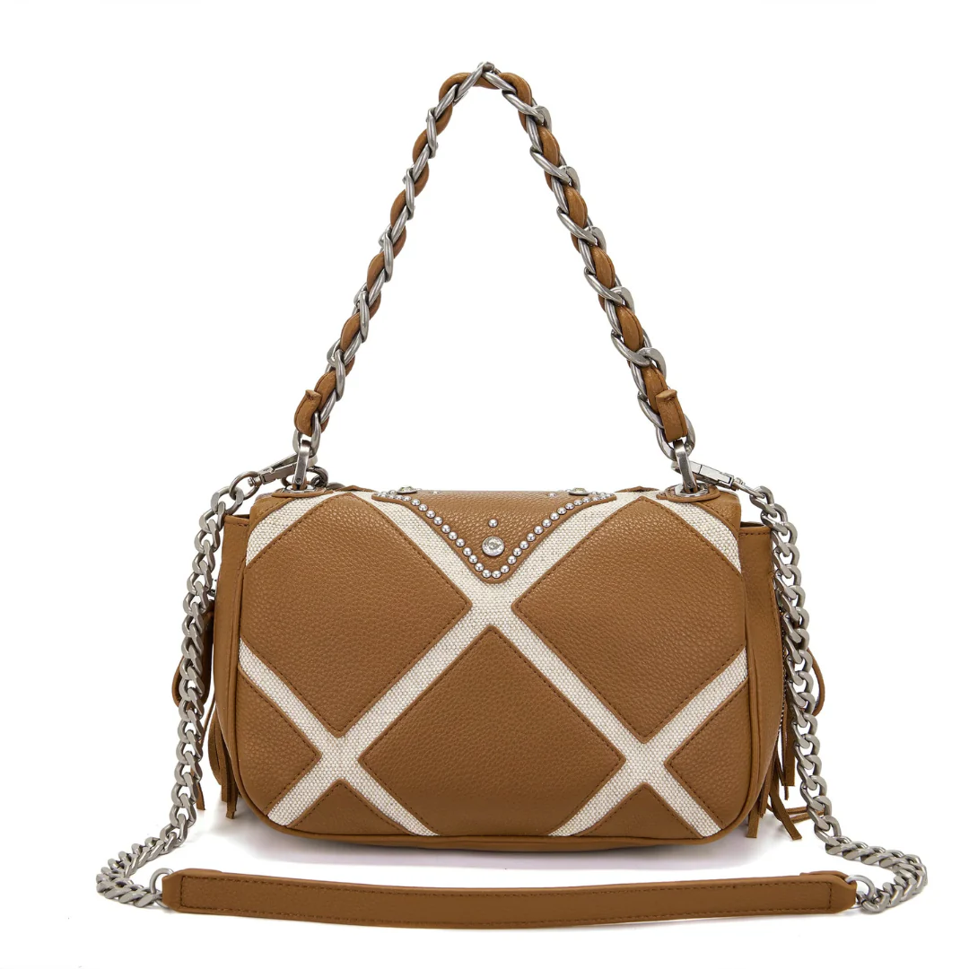 Dettagli prodotto: Borsa a spalla in PU e canvas Lavorazione a rombi cuciti decorati da strass e borchie Manico in catena infilato in PU e tracolla rimovibile Dimensioni: 32x13x19cm Codice: 161M-BZ-441-CAS