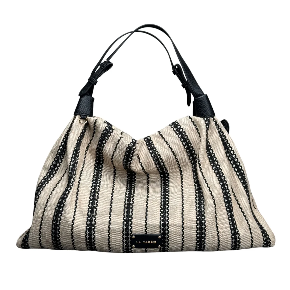 Dettagli prodotto: Borsa shopping in canvas a righe verticali Due manici regolabili Colore beige con profili nero Dimensioni: 56x2x32cm Codice: 161M-TX-302-CAS