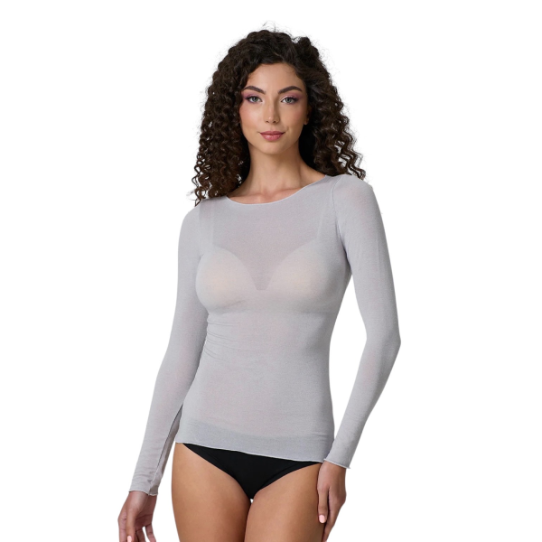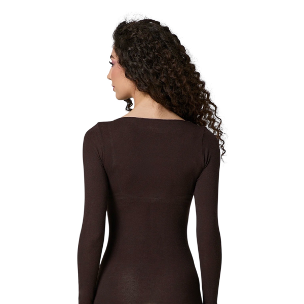 Il design con scollo a barca valorizza le spalle e il décolleté, creando un effetto elegante e naturale. Le maniche lunghe e la linea aderente conferiscono un tocco sensuale ma mai eccessivo, perfetto per look quotidiani o più sofisticati. Inoltre, il tessuto elasticizzato segue dolcemente la silhouette, adattandosi con armonia a ogni fisicità.