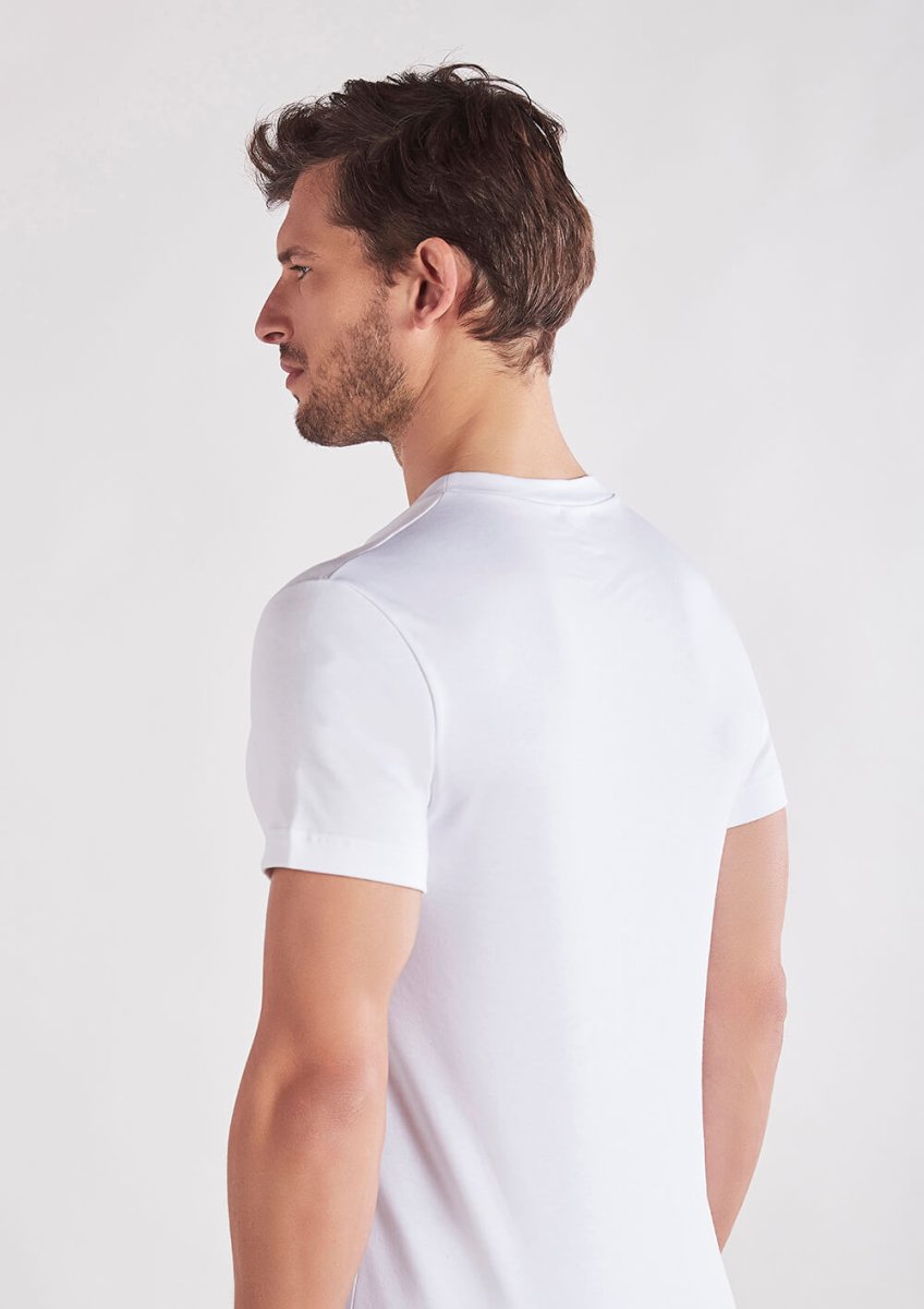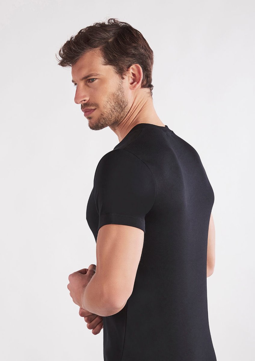 La maglia a scollo V con mezza manica in caldo cotone unisce funzionalità e comfort. La finitura a mano pesca regala un tocco vellutato, mentre la struttura del tessuto assicura isolamento leggero e traspirabilità. Perfetta come intimo maschile per le stagioni fredde o come sottogiacca pratico e resistente ai lavaggi.