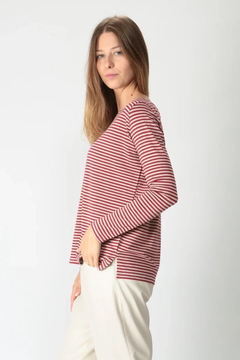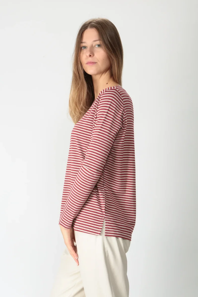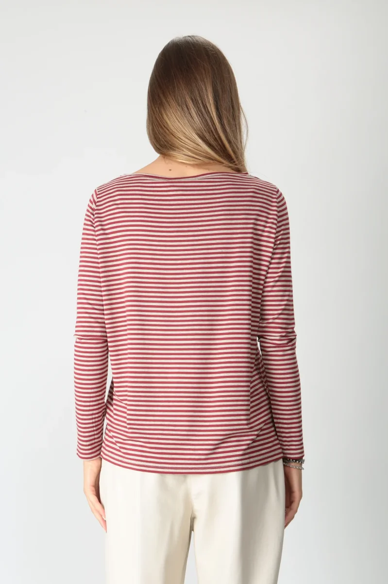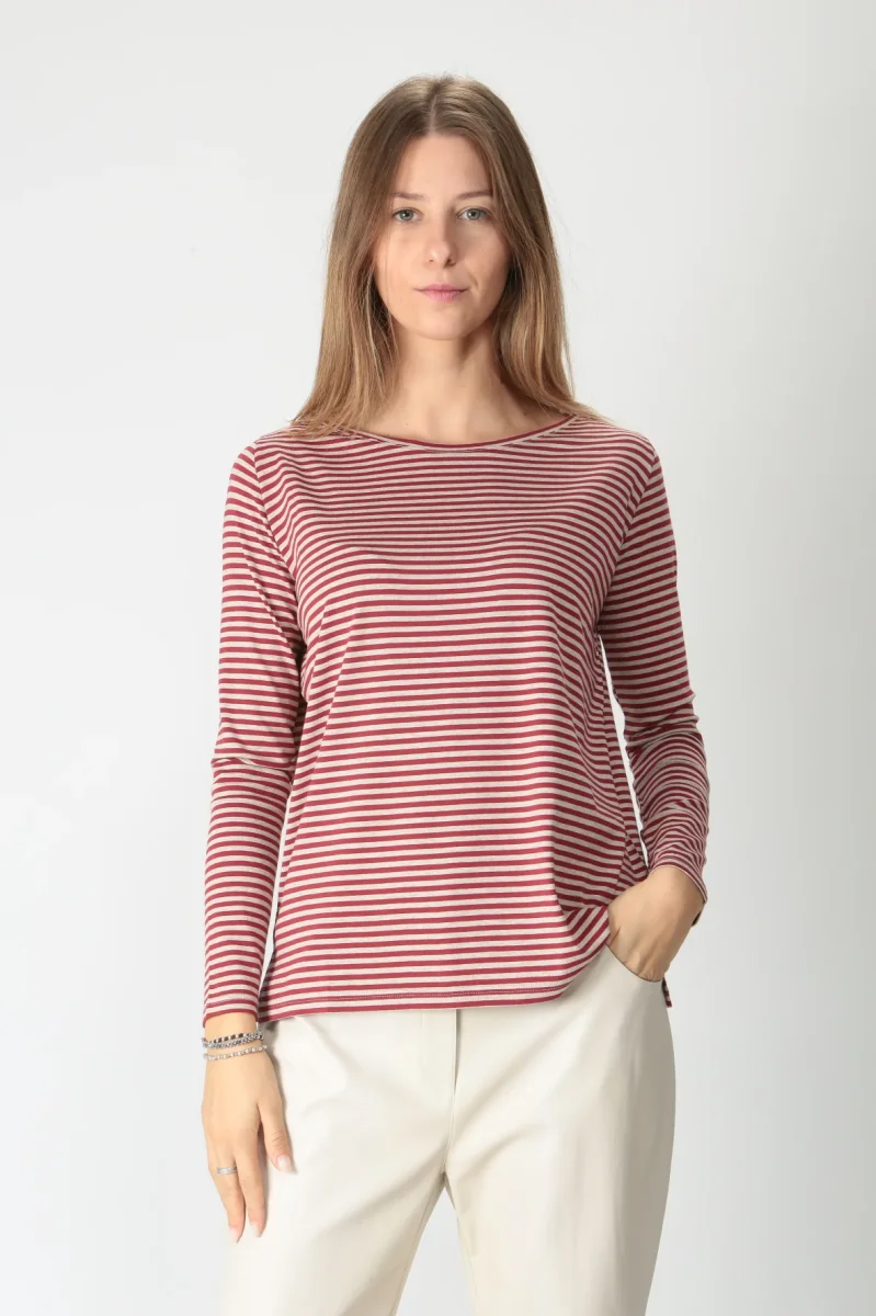 Maglia girocollo in viscosa. Manica lunga. Spacchi laterali. Volume morbido. Disponibile anche nella riga nera. La modella indossa la taglia XS. La modella è alta 1,70 m. 95% Viscosa, 5% Elastan. – Codice articolo: 245M5042 – Colore articolo: riga rossa – Girocollo – Volume morbido – Made in Italy
