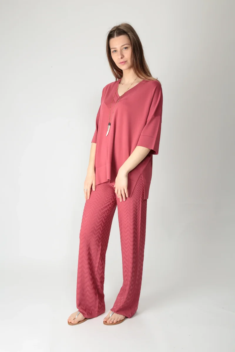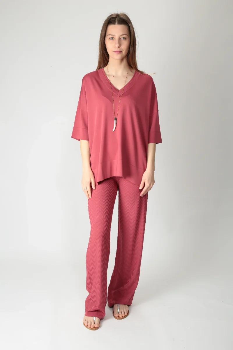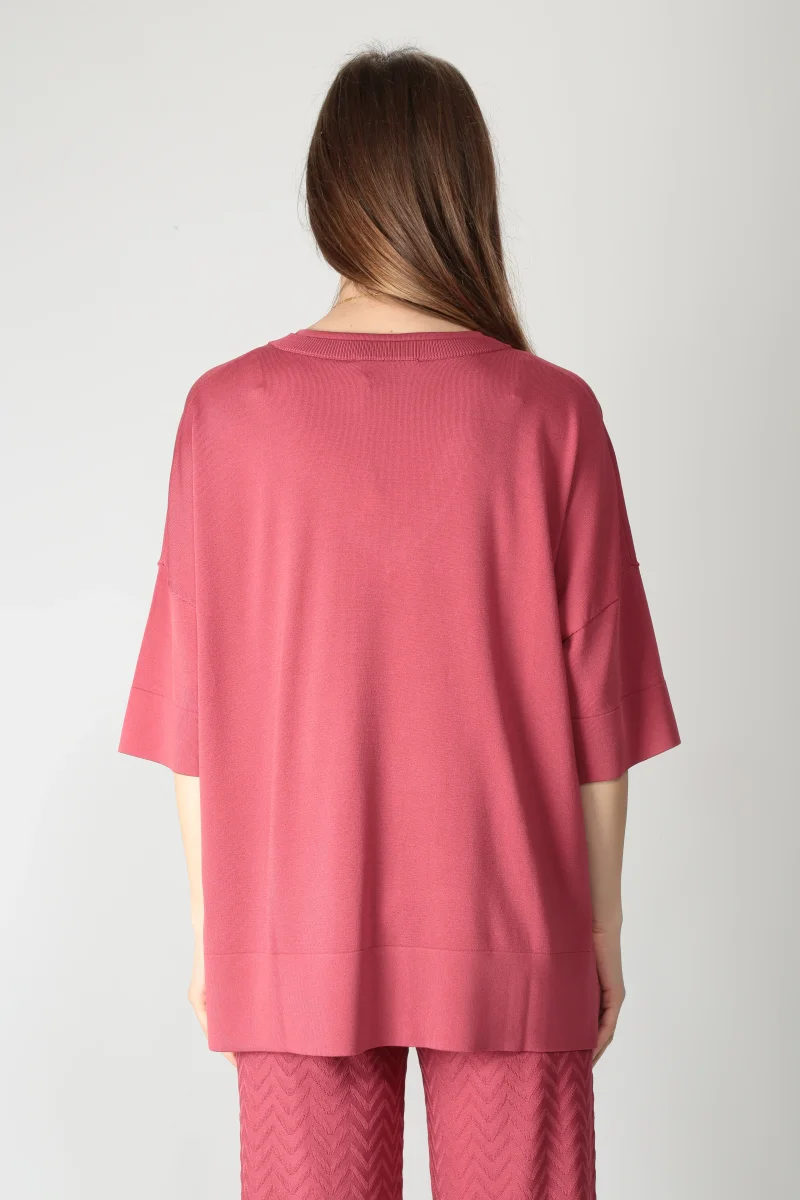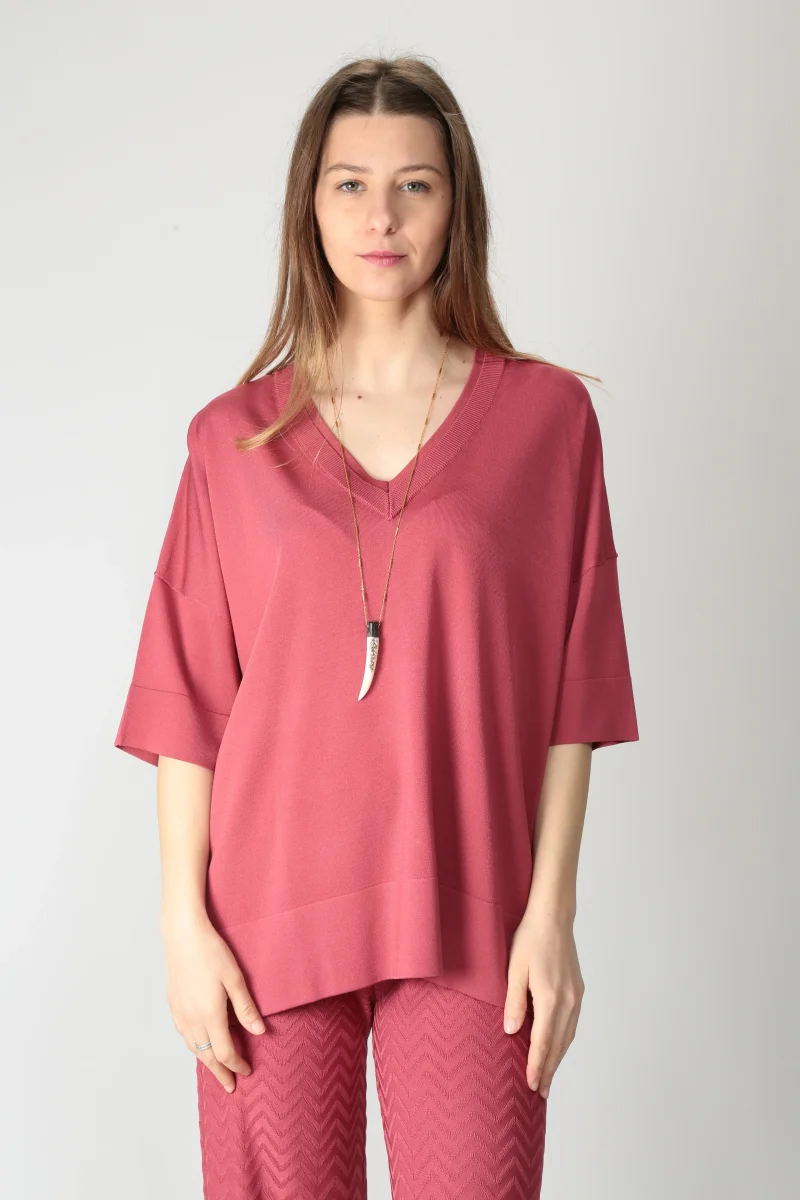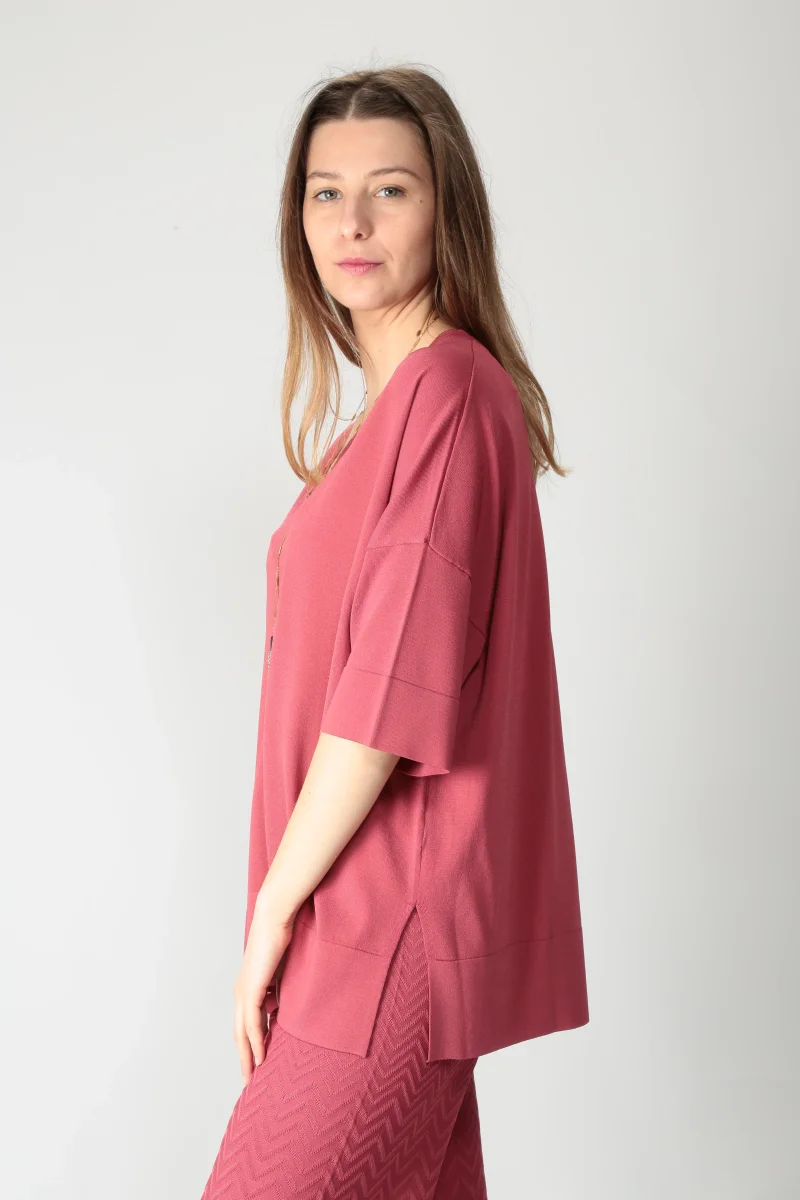 Maglia in misto viscosa. Scollo a V con doppio profilo, uno rifinito a costine. Spalla scesa. Manica corta. Spacchi laterali. Volume oversize. Disponibile anche nel colore blu.
