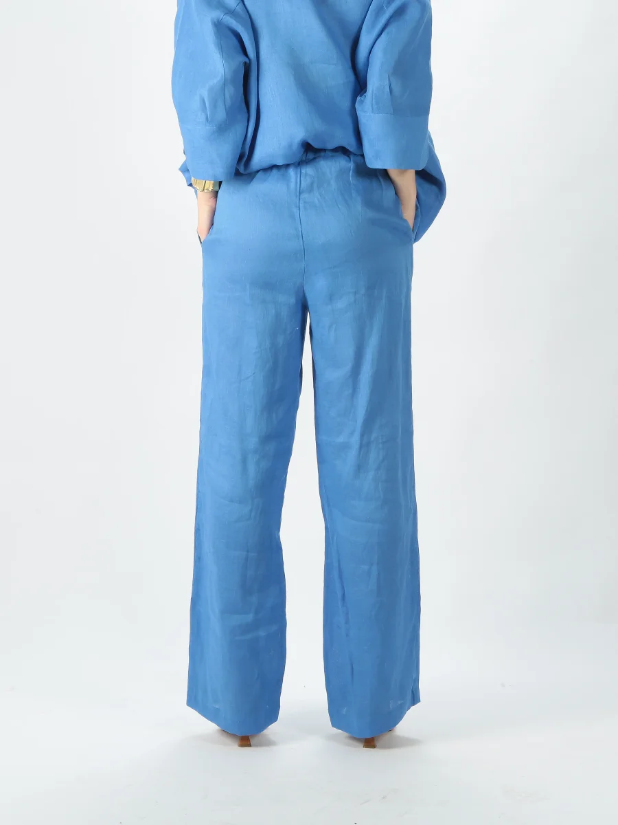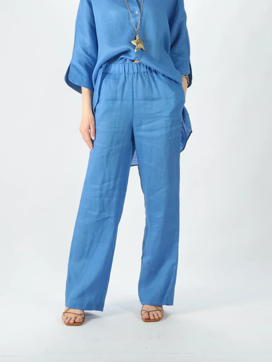 Pantalone a palazzo in lino. Elastico in vita. Tasche a filetto sul fianco. Gamba lunga e morbida. Disponibile anche nel colore beige. Possibilità di abbinarla alla sua camicia – art. 23285 –