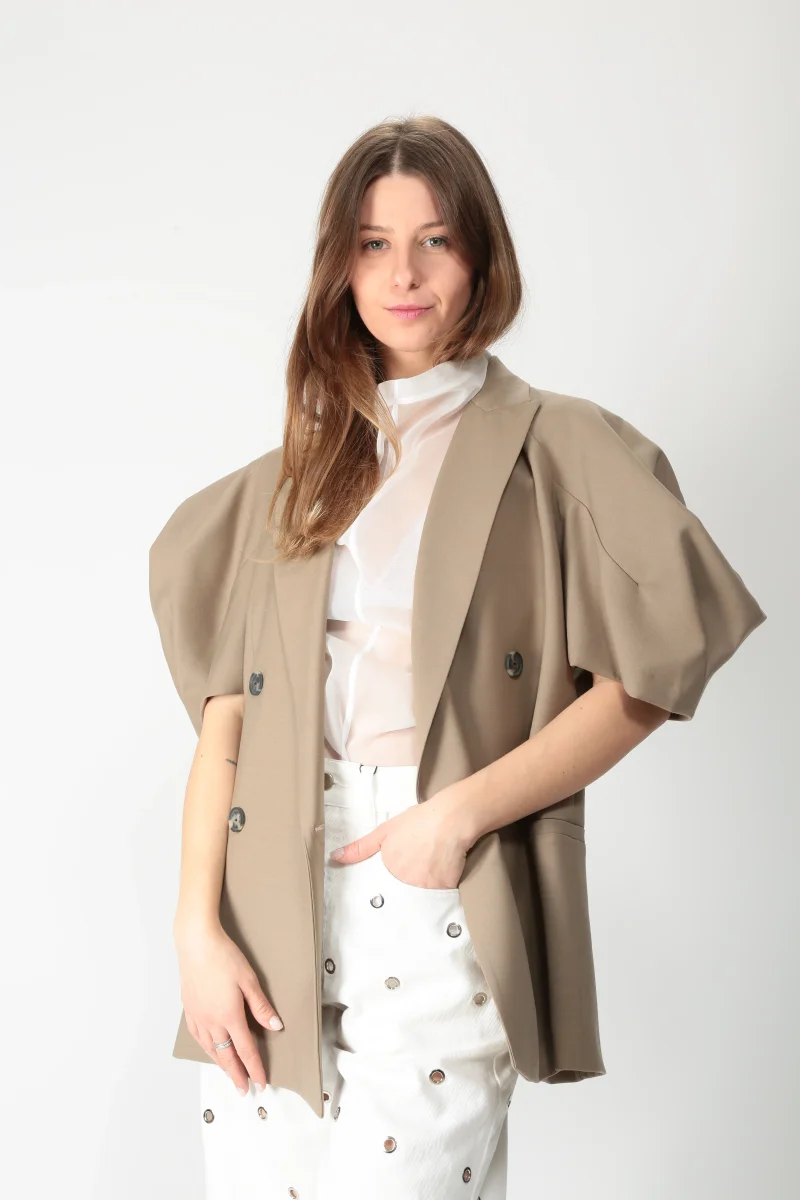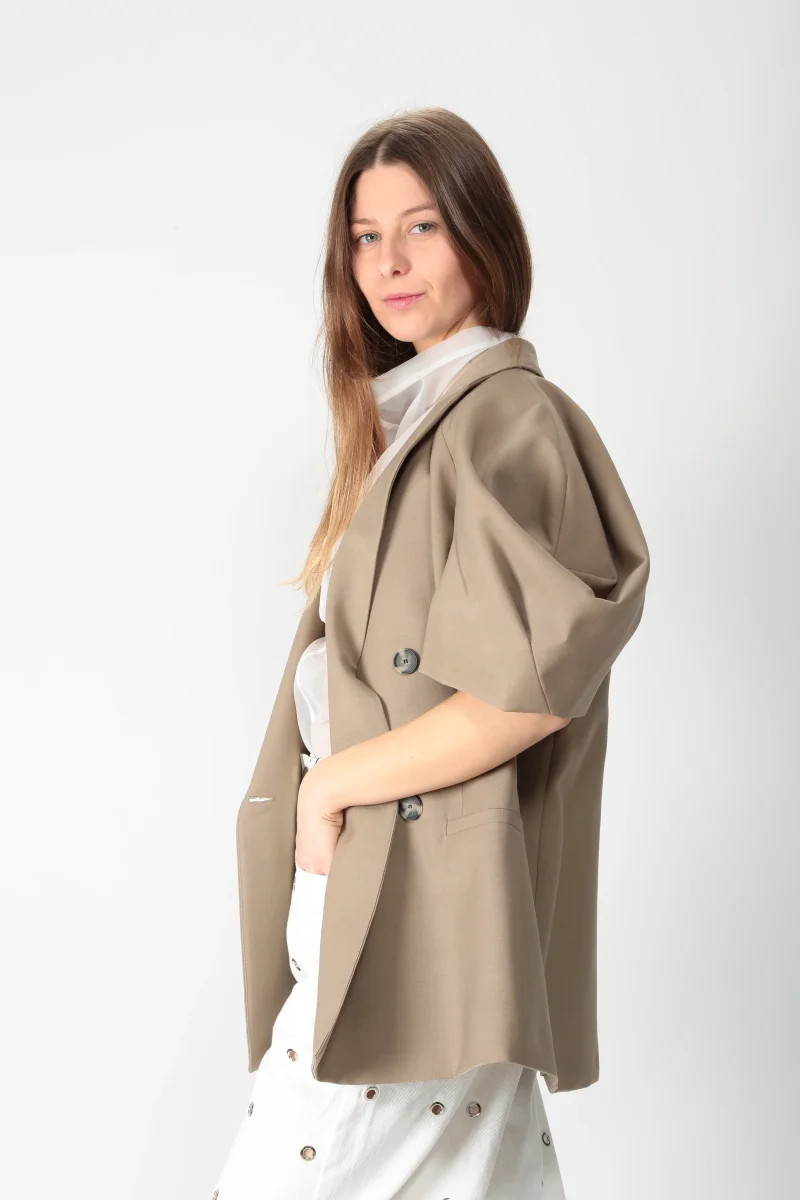 Giacca doppiopetto. Rever classico. Manica corta a palloncino. Taglio della manica a raglan. CHisura con bottoni. Tasche a filetto. Alto spacco nella parte posteriore. Modello lungo. Foderata. Possibilità di abbinarla alla sua gonna – art. M6PH03 –