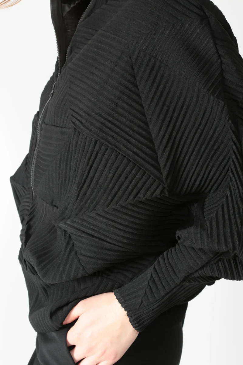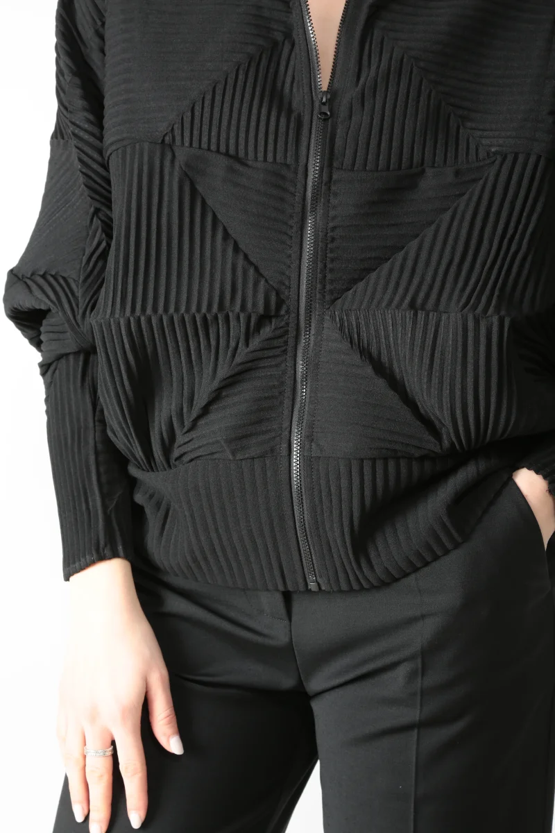 Giacca plissè con motivo geometrico. Collo rialzato. Manica lunga a kimono. Chiusura con zip. Modello bomber. Volume morbido.