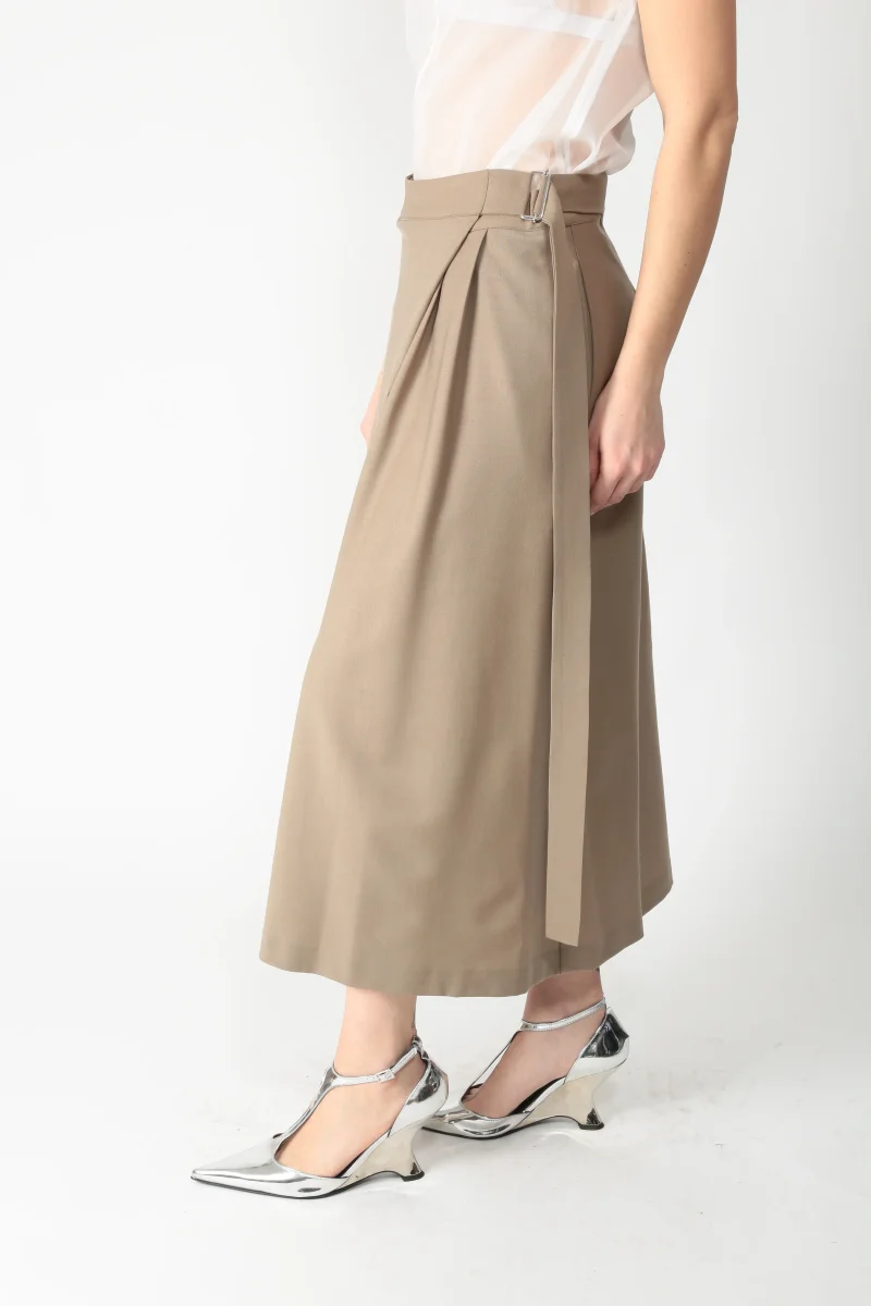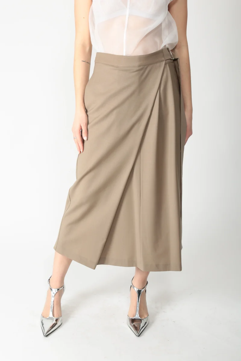 Gonna a portafoglio. Fascione in vita con chiusura con gancio e zip. Laccio laterale con fibbia. Tasche a filetto sul fianco e tasca unica a filetto nella parte posteriore. Modello svasato.