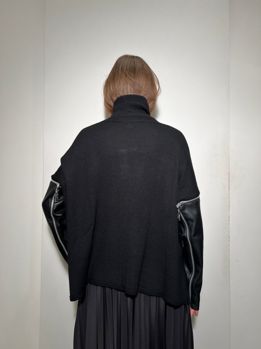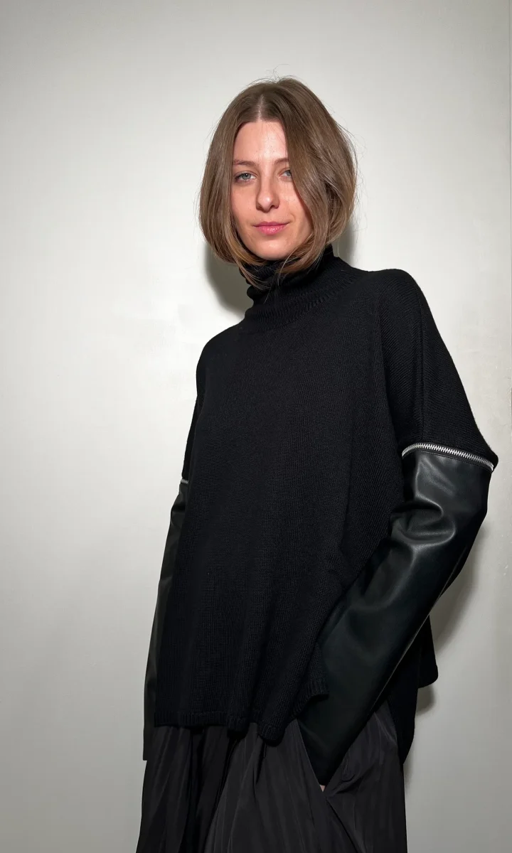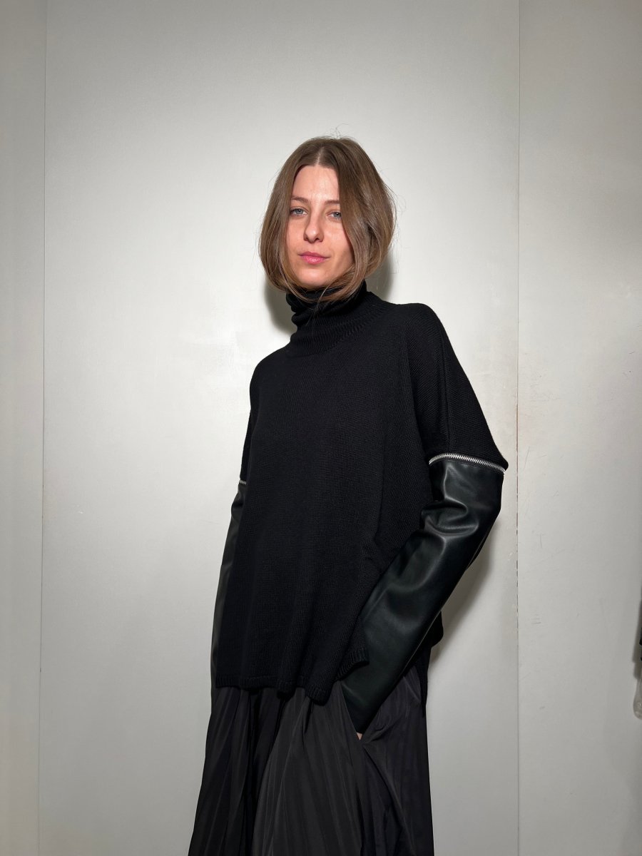 Maglia realizzata in lana. Collo rialzato. Manica lunga con zip che permette di staccare parte della manica realizzata in ecopelle. Zip sul lato interno della manica. Spacchi laterali. Volume morbido. UNa piccola costa rifinisce il collo e il fondo.